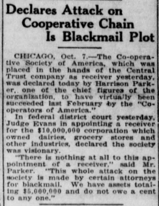 Declares Attack on Cooperative Chain Is Blackmail Plot CHICAGO, Oct. 7.-The Co-operative Society of America, which was placed in the hands of the Central Trust company as receiver yesterday, was declared today by Harrison Parker, one of the chief figures of the organization, to have virtually been succeeded last February by the "Cooperators of America." In federal district court yesterday. Judge Evans in appointing a receiver for the $10,000,000 corporation which owned dairies, grocery stores and other Industries, declared the society was visionary. "There is nothing at all to this appointment of a receiver," said Mr. Parker. "This whole attack on the society is made by certain attorneys for blackmail. We have assets totaling $6,000,000 and do not owe a cent to any one."