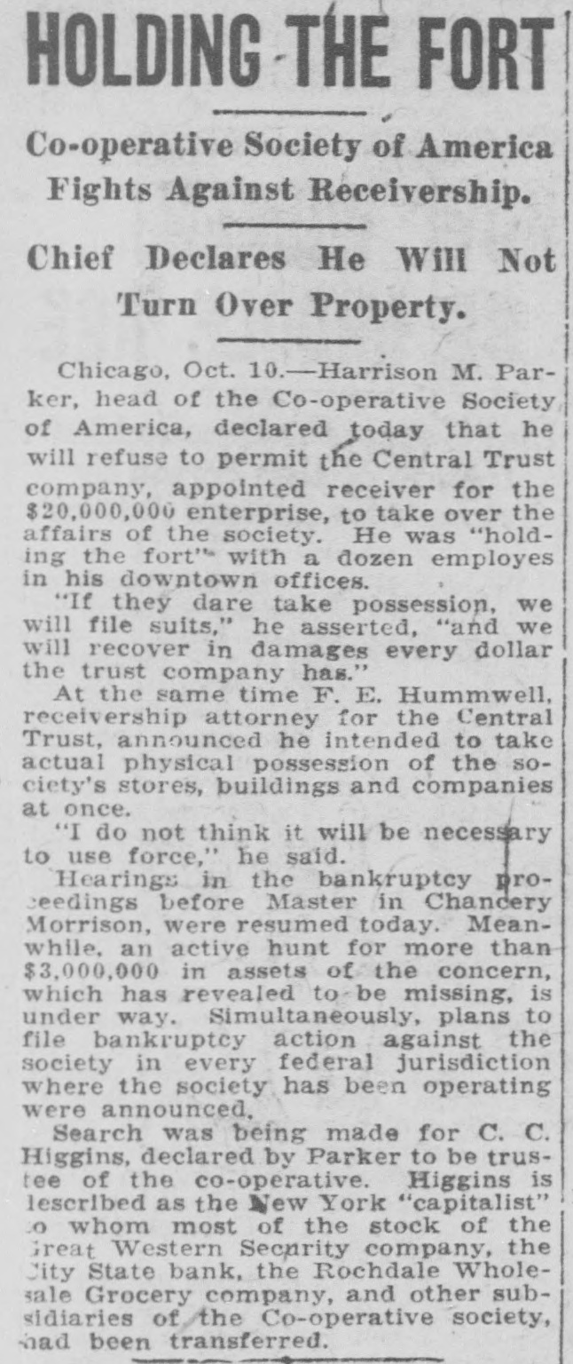 HOLDING THE FORT Co-operative Society of America Fights Against Receivership. Chief Declares He Will Not Turn Over Property. Chicago, Oct. 10.-Harrison M. Parker, head of the Co-operative Society of America, declared today that he will refuse to permit the Central Trust company, appointed receiver for the $20,000,000 enterprise, to take over the affairs of the society. He was "holding the fort" with a dozen employes in his downtown offices. "If they dare take possession, we will file suits," he asserted, "and we will recover in damages every dollar the trust company has." At the same time F. E. Hummwell, receivership attorney for the Central Trust, announced he intended to take actual physical possession of the society's stores, buildings and companies at once. "I do not think it will be necessary to use force," he said. Hearings in the bankruptcy proseedings before Master in Chancery Morrison, were resumed today. Meanwhile, an active hunt for more than $3,000,000 in assets of the concern, which has revealed to be missing, is under way. Simultaneously, plans to file bankruptcy action against the society in every federal jurisdiction where the society has been operating were announced. Search was being made for C. C. Higgins, declared by Parker to be trustee of the co-operative. Higgins is lescribed as the New York "capitalist" O whom most of the stock of the Great Western Security company, the City State bank, the Rochdale Wholesale Grocery company, and other subsidiaries of the Co-operative society, had been transferred.