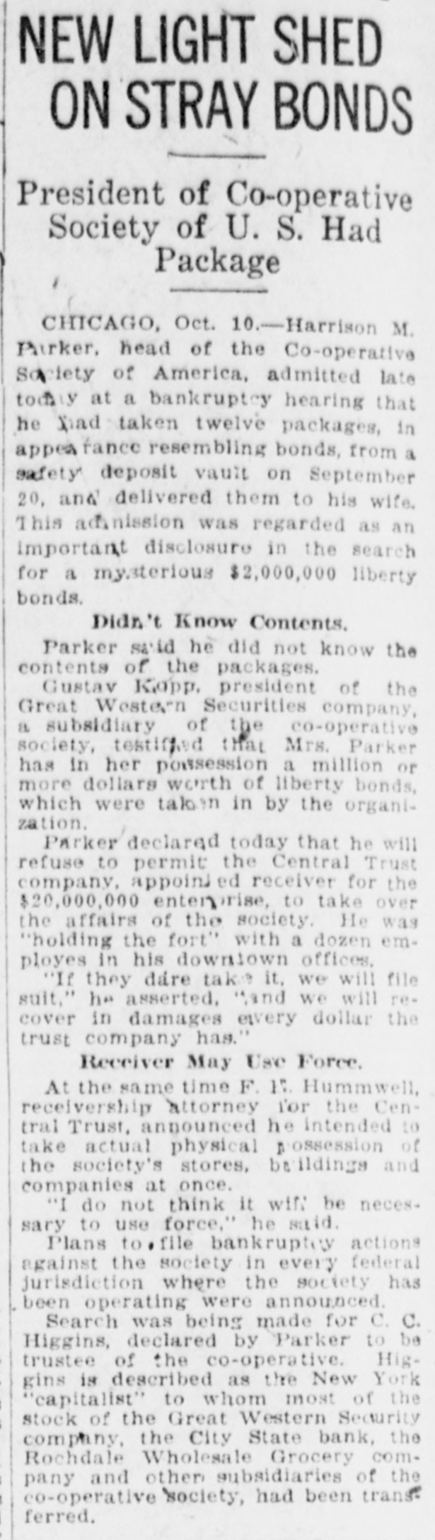 NEW LIGHT SHED ON STRAY BONDS President of Co-operative Society of U. S. Had Package CHICAGO, Oct. 10.-Harrison M. Parker, head of the Co-operative Society of America, admitted late today at a bankruptcy hearing that he had taken twelve packages, in appearance resembling bonds, from a safety deposit vauit on September 20, and delivered them to his wife. This admission was regarded as an important disclosure in the search for a mysterious $2,000,000 liberty bonds Didn't Know Contents. Parker said he did not know the contents of the packages. Gustav Kapp. president of the Great Western Securities company, a subsidiary of the co-operative society, testified that Mrs. Parker has in her possession a million or more dollars worth of liberty bonds, which were taloen in by the organization. Parker declared today that he will refuse to permit the Central Trust company, appoint ed receiver for the $20,000,000 enterprise, to take over the affairs of the society. He was "holding the fort" with a dozen employes in his downdown offices. "If they dare take it. we will file suit," he asserted, "and we will recover in damages every dollar the trust company has." Receiver May Use Force. At the same time F. 17 Hummwell, receivership attorney for the Central Trust, announced he intended to take actual physical possession of the society's stores, buildings and companies at once. "I do not think it with be necessary to use force," he said. Plans to file bankruptcy actions against the society in every federal jurisdiction where the society has been operating were announced Search was being made for C. C. Higgins, declared by Parker to be trustee of the co-operative Higgins is described as the New York "capitalist" to whom most of the stock of the Great Western Security company, the City State bank, the Rochdale Wholesale Grocery company and other subsidiaries of the co-operative society, had been trans. ferred.