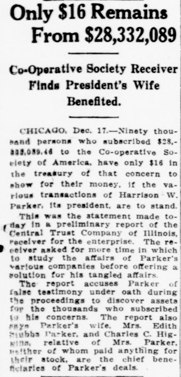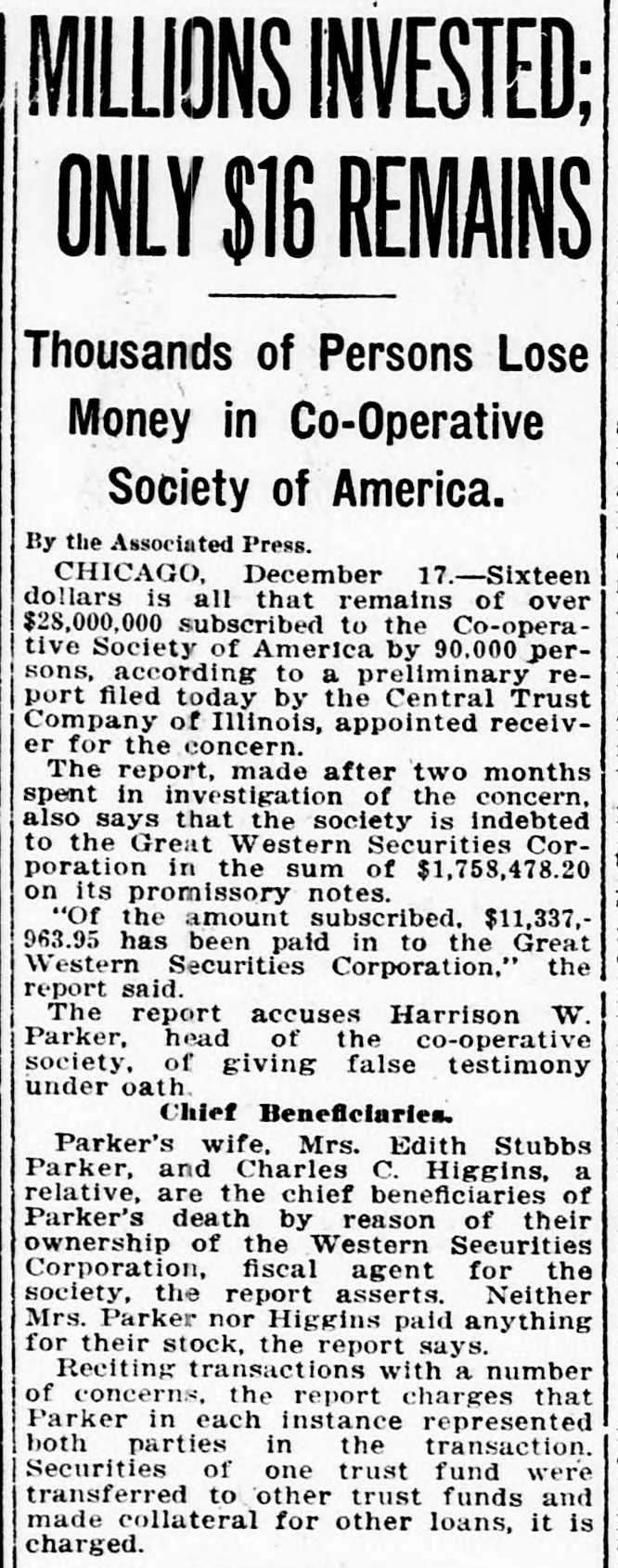 MILLIONS INVESTED; ONLY $16 REMAINS Thousands of Persons Lose Money in Co-Operative Society of America. By the Associated Press. CHICAGO, December 17.-Sixteen dollars is all that remains of over $28,000,000 subscribed to the Co-operative Society of America by 90.000 persons, according to a preliminary report filed today by the Central Trust Company of Illinois, appointed receiver for the concern. The report, made after two months spent in investigation of the concern, also says that the society is indebted to the Great Western Securities Corporation in the sum of $1,758,478.20 on its promissory notes. "Of the amount subscribed, $11,337,963.95 has been paid in to the Great Western Securities Corporation," the report said. The report accuses Harrison W. Parker, head of the co-operative society, of giving false testimony under oath Chief Beneficiaries. Parker's wife, Mrs. Edith Stubbs Parker, and Charles C. Higgins, a relative, are the chief beneficiaries of Parker's death by reason of their ownership of the Western Securities Corporation, fiscal agent for the society, the report asserts. Neither Mrs. Parker nor Higgins paid anything for their stock, the report says. Reciting transactions with a number of concerns, the report charges that Parker in each instance represented both parties in the transaction. Securities of one trust fund were transferred to other trust funds and made collateral for other loans, it is charged.