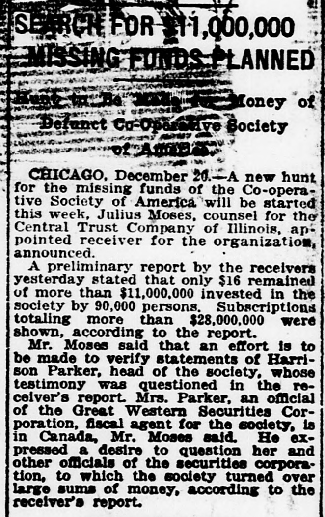 RECEIVER SEEKS $11,000,000. Will Hunt for Missing Funds of Cooperative Society of America. CIHCAGO, Dec. 19-A new hunt for the missing funds of the Co-operative Society of America will be started this week, Julius Moses, counsel for the Central Trust Co. of Illinois, appointed receiver for the organization, announced last night. A preliminary report by the receiver Saturday stated that only $16 remained of over $11,000,000 invested in the society by 90,000 persons. Subscriptions totaling more than $28,000,000 were shown, according to the report. Mr. Moses said that an effort is to be made to verify statements of Harrison Parker, head of the society, whose testimony was questioned in the receiver's report. Mrs. Parker, an official of the Great Western Securities corporation, fiscal agent of the society, is in Canada, Mr. Moses said. He expressed a desire to question her and other officials of the securities corporation to which the society turned over large sums of money, according to the receiver's report.