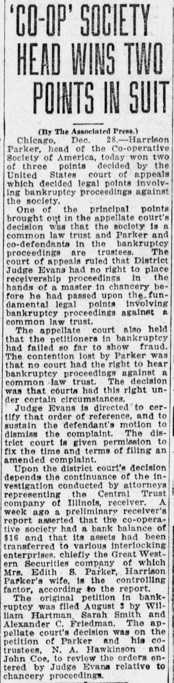 'CO-OP' SOCIETY HEAD WINS TWO POINTS IN SUIT (By The Associated Press.) Chicago, Dec. 28.-Harrison Parker, head of the Co-operative Society of America, today won two of three points decided by the United States court of appeals which decided legal points involving bankruptcy proceedings against the society. One of the principal points brought out in the appellate court's decision was that the society is a common law trust and Parker and co-defendants in the bankruptcy proceedings are trustees. The court of appeals ruled that District Judge Evans had no right to place receivership proceedings in the hands of a master in chancery before he had passed upon the. fundamental legal points involving bankruptcy proceedings against a common law trust. The appellate court also held that the petitioners in bankruptcy had failed so far to show fraud. The contention lost by Parker was that no court had the right to hear bankruptcy proceedings against a common law trust. The decision was that courts had this right under certain circumstances. Judge Evans is directed to certify that order of reference, and to sustain the defendant's motion to dismiss the complaint. The district court is given permission to fix the time and terms of filing an amended complaint. Upon the district court's decision depends the continuance of the investigation conducted by attorneys representing the Central Trust company of Illinois, receiver. A week ago a preliminary receiver's report asserted that the co-operative society had a bank balance of $16 and that its assets had been transferred to various interlocking enterprises, chiefly the Great Western Securities company of which Mrs. Edith S. Parker, Harrison Parker's wife, is the controlling factor, according to the report. The original petition in bankruptcy was filed August 3 by William Hartman, Sarah Smith and Alexander C. Friedman. The appellate court's decision was on the petition of Parker and his cotrustees, N. A. Hawkinson and John Coe, to review the orders entered by Judge Evans relative to chancery proceedings.