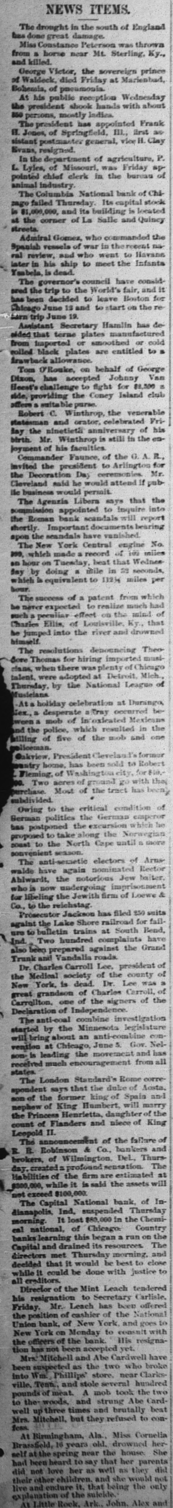 SKILL SMIN purplay to upnos am up sq2moup PL aSsurep seads puop 1 Miss Constance Peterson was thrown "AX Street TK seau essay . most pus George Victor, the sovereign prince of Waldeck, died Friday at Marienbad, to At his public reception Wednesday shoqe upin spang roogs eggs was Apron "worled Frank permodds - supply one - sug "III jo secor B sistent postmaster general, vice H. Clay THEAS In the department of agriculture, P. L Lyles, of Missouri, was Friday ap pointed chief clerk in the bureau of Insury The Columbia National bank of Chipage failed Thursday. Its capital stock si Surping #13 pas 1000'000'18 M County pue "Hes =1 10 anys " rejocurse on popumentos on Toung require en 1 #1 THAN jo dejouds GURAUH os oqas pas later in his ship to meet the Infanta peap "T A The governor's council have consid# pus upg SPHOM em of dus an pass познод I 03 paperson used any as em no of pus $1 *ung 61 sung due Assistant Secretary Hamlin has depayable 3mgs paper ppoo 20 persons 20 possodert man colled black plates are entitled to a drawback allowance. Tom O'Rouke, on behalf of George ""A Augos wang "noxp) = GOV'ES 403 142g or que purpsy ags tapps used . usage Robert c. Winthrop, the venerable 1M pus 44 10 any sog -00 on 41 me ") PM joyment of his faculties a V D am to "counts aog of supplead ags possam ** - (eg agg -qnd # prope p[nom on pper prom everying PM The Agenzia Libera says that the only of persodde the Roman bank scandals will report shortly. Important documents bearing spon the scandals have vanished. The New York Central engine No. same 501 20 program = open This 'ose 1991 years to mon "spuses as "I PUB . Empop sq Aug and wages Mail or 43 question unon The success of a patent from which per ques or - eq 10 payment eggs no - signs Charles Ellis, of Louisville, Ky., that рашогр pure дэлу am open podmint THE all done Thomas for hiring imported must30 freed WEAL aregs паца "seraja 15 perdops asam "juates to onder] am 4q Musicians Ats holiday celebration at Durango, Sex., a desperate Tray occurred beservices to qoin . on or *sogod our put - pus qoen an to asy 10 policeman. Oakview, President Clevelan I's former 01 ppos daily seq -*018 20; AP jo heigs of punni# p cause OML Euroq very part an 10 **N subdivided. 10 подурала an of Zupao deman any on поципаха age seq any Suoje any) of passioned assoss 13 111" aday "N"N anys of INBOR instruction The anti-semetic electors of Arnspopearmon easy oppens mar spotion anys MON " our 7 amount to may ags any "If a g with 05% PM9 very 05 201 short I am supelle are to bulletin trains at South Bend, DATE parpuny onL put punio an paradaid coag OST# spear pere Munij Dr. Charles Carroll Lee, president of 10 Ajunce am 10 any = NEW was 41 peop = The MON 20 to Hospuers your our 10 such am to ago Declaration of Independence. The anti-eoal combine investigation started by the Minnesota legislature -tano этушоэ-рия us shops Super 11146 -1°N 400 $ aune = поршал were pue an Surpect sq -mos II" may qoint parages wayse The London Standard's Rome correspondent says that the duke of Aosta. son of the former king of Spain and 11144 Suiy 10 моцдон the Princess Henrietta, daughter of the Buty 10 soaps pus go funos "II I The announcement of the failure of and Bankers & Co. Bobinson at of brokers, of Wilmington, DeL. Thursday. created = profound sensation. The = are may age to ******* IIIM spouse am press , # "U" "000^0000 000'0018 pasoxa pers The Capital National bank, of Indianapolis, Ind. suspended Thursday - and u; 000'09$ 1ˢᵗ # Surasous cal national, of Chicago: Country em no una . unding *Typ Insurance squaq Capital and drained its resources. The directors met Thursday morning. and decided that it would be best to close 01 agset эпор aq # II" Director of the Mint Leach tendered his resignation to Secretary Carlisle. Friday. Mr. Leach has been offered the position of cashier of the National Union bank. of New York, and goes to New York on Monday to consult with the officers of the bank. Ilis resigna705 usaq tou seq non Mrs. Mitchell and Abe Cardwell have been suspected as the two who broke into Wm., Phillips' store. near Clarksville. Tenn. and stole several hundred on an 1001 qoin V year to spunod -pre) av Bunns pue "spoom Logs of well up three times and brutally beat Mrs. Mitchell. but they refused to con**** At Birmingham, Ala., Miss Cornelia Brassfield, 16 years old. drowned heraug cosnoq on avou Sunads our nos squared Joy seqs Ses 01 pauay useq puq PIP su ITAM su req здор you PIP you ays puu asquo again