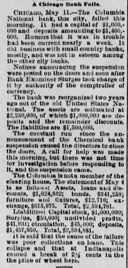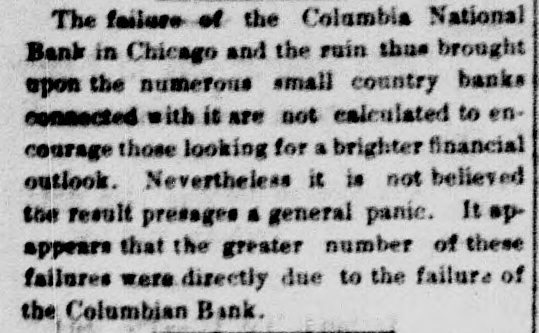 The failure of the Columbia National Bank in Chicago and the ruin thus brought upon the numerous small country banks connected with it are not calculated to encourage those looking for a brighter financial outlook. Nevertheless it is not believed the result presages a general panic. It appears that the greater number of these failures were directly due to the failure of the Columbian Bank.