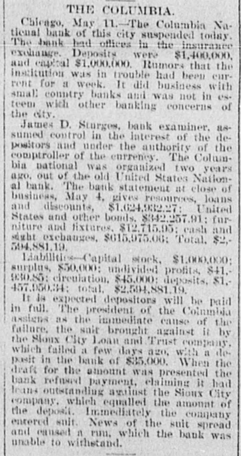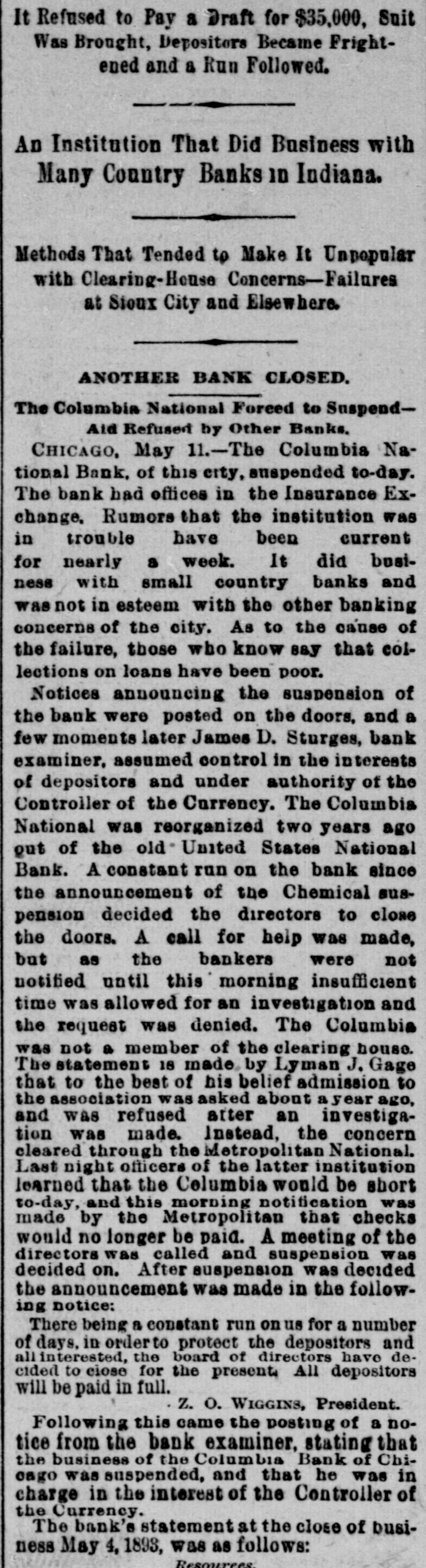 It Refused to Pay a Draft for $35,000, Suit Was Brought, Depositors Became Frightened and a Run Followed. An Institution That Did Business with Many Country Banks 10 Indiana. Methods That Tended to Make It Unpopular with Clearing-House Concerns-Failures at Sioux City and Elsewhere. ANOTHER BANK CLOSED. The Columbia National Forced to SuspendAid Refused by Other Banks. CHICAGO, May 11.-The Columbia National Bank, of this city, suspended to-day. The bank had offices in the Insurance Exchange. Rumors that the institution was in trouble have been current for nearly a week. It did business with small country banks and wasnoti in esteem with the other banking concerns of the city. As to the cause of the failure, those who know say that collections on loans have been poor. Notices announcing the suspension of the bank were posted on the doors, and a few moments later James D. Sturges, bank examiner. assumed control in the interests of depositors and under authority of the Controller of the Currency. The Columbia National was reorganized two years ago out of the old United States National Bank. A constant run on the bank since the announcement of the Chemical suspension decided the directors to close the doors. A call for help was made, but as the bankers were not notified until this morning insufficient time was allowed for an investigation and the request was denied. The Columbia was not a member of the clearing house. The statement 18 made by Lyman J. Gage that to the best of his belief admission to the association was asked about a year: ago, and was refused after an investigation was made. Instead, the concern cleared through the Metropolitan National. Last night officers of the latter institution learned that the Columbia would be short to-day, and this morning notification was made by the Metropolitan that checks would no longer be paid. A meeting of the directors was called and suspension was decided on. After suspension was decided the announcement was made in the following notice: There being a constant run on us for a number of days. in orderto protect the depositors and all interested, the board of directors have decided to close for the present All depositors will be paid in full. z. O. WIGGINS, President. Following this came the posting of a notice from the bank examiner, stating that the business of the Columbia Bank of Chicago was suspended, and that he was in charge in the interest of the Controller of the Currency. The bank's statement at the close of business May 4, 1893, was as follows: Resources