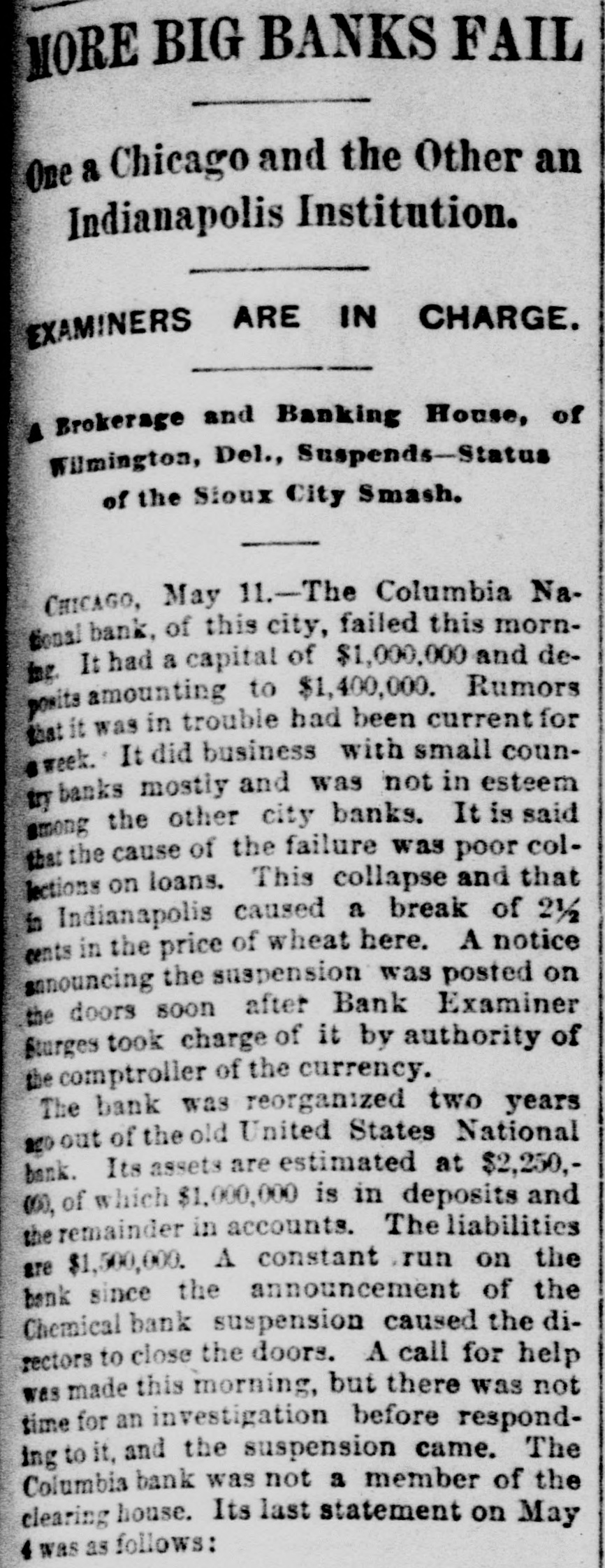 # A Chicago Bank Fails. CHICAGO, May 11.-The Columbia National bank, this city, failed this morning. It had a capital of $1,000,000 and deposits amounting to $1,400,000. Rumors that it was in trouble had been current nearly a week. It did business with small country banks, mostly, and was not in esteem among the other city banks. Notices announcing the suspension were posted on the doors and soon after Bank Examiner Sturges took charge of it by authority of the comptroller of currency. The bank was reorganized two years ago out of the old United States National. The assets are estimated at $2,250,000, of which $1,000,000 are deposits and the remainder discounts. The liabilities are $1,500,000. The constant run since the announcement of the Chemical bank suspension caused the directors to close the doors. A call for help was made this morning, but there was not time for investigation before responding to it, and the suspension came. The Columbia is not a member of the clearing house. The statement of May 4 is as follows: Assets, loans and discounts, $1,624,832; bonds, $841,258; furniture and fixtures, $12,716; exchange, $615,975. Total, $2,594,781. Liabilities: Capital stock, $1,000,000; Surplus, $50,000; undivided profits, $41,931; circulation, $45,000; deposits, $1,457,950. Total, $2,594,881. It is said that the cause of the failure was poor collections on loans. This collapse and that at Indianapolis caused a break of 2½ cents in the price of wheat here.