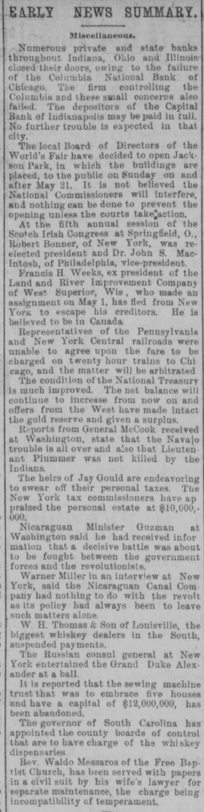 EARLY NEWS SUMMARY. Miscellaneous. Numerous private and state banks throughout Indiana, Ohio and Illinois closed their doors, owing to the failure of the Columbia National Bank of Chicago. The firm controlling the Columbia and these small concerns also failed. The depositors of the Capital Bank of Indianapolis may be paid in full. No further trouble is expected in that city. The local Board of Directors of the World's Fair have decided to open Jackson Park, in which the buildings are placed, to the public on Sunday on and after May 21. It is not believed the National Commissioners will interfere, and nothing can be done to prevent the opening unless the courts take*action. At the fifth annual session of the Scotch Irish Congress at Springfield, O., Robert Bonner, of New York, was reelected president and Dr. John S. MacIntosh, of Philadelphia, vice-president. Francis H. Weeks, ex president of the Land and River Improvement Company of West Superior, Wis, who made an assignment on May 1, has fled from New York to escape his creditors. He is believed to be in Canada Representatives of the Pennsylvania and New York Central railroads were unable to agree upon the fare to be charged on twenty hour trains to Chi cago, and the matter will be arbitrated The condition of the National Treasury is much improved. The net balance will continue to increase from now on and offers from the West have made intact the gold reserve and given a surplus. Reports from General McCook received at Washington, state that the Navajo trouble is all over and also that Lieutenant Plummer was not killed by the Indians. The heirs of Jay Gould are endeavoring to swear off their personal taxes. The New York tax commissioners have ap praised the personal estate at $10,000,000. Nicaraguan Minister Guzman at Washington said he had received infor mation that a decisive battle was about to be fought between the government forces and the revolutionists. Warner Miller in an interview at New York, said the Nicaraguan Canal Com pany had nothing to do with the revolt as its policy had always been to leave such matters alone. W. H. Thomas & Son of Louisville, the biggest whiskey dealers in the South, suspended payments. The Russian consul general at New York entertained the Grand Duke Alexander at a ball. It is reported that the sewing machine trust that was to embrace five houses and have a capital of $12,000,000, has been abandoned. The governor of South Carolina has appointed the county boards of control that are to have charge of the whiskey dispensaries. Rev. Waldo Messaros of the Free Bap. tist Church, has been served with papers in a civil suit by his wife's lawyer for separate maintenance, the charge being incompatibility of temperament.