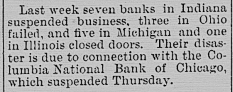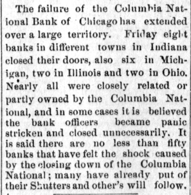 The failure of the Columbia National Bank of Chicago has extended over a large territory. Friday eight banks in different towns in Indiana closed their doors, also six in Michigan, two in Illinois and two in Ohio. Nearly all were closely related or partly owned by the Columbia National, and in some cases it is believed the bank officers became panic stricken and closed unnecessarily. It is said there are no less than fifty banks that have felt the shock caused by the closing down of the Columbia National; many have already put of their Shutters and other's will follow.