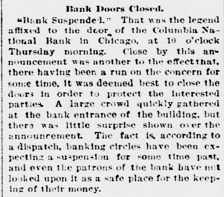 Bank Doors Closed. Bank Suspended." That was the legend affixed to the door of the Columbia National Bank in Chicago, at 10 o'clock Thursday morning. Close by this announcement was another to the effect that, there having been a run on the concern for some time. it was deemed best to close the doors in order to protect the Interested parties A large crowd quickly gathered at the bank entrance of the building, but there was little surprise shown over the announcement. The fact is, according to a dispatch, banking circles have been expecting a suspension for some time past, and even the patrons of the bank have not looked upon it as a safe place for the keep. ing of their money.