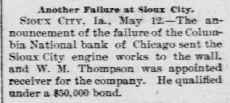 Another Failure at Sloux City. SIOUX CITY, Ia., May 12.-The announcement of the failure of the Columbia National bank of Chicago sent the Sioux City engine works to the wall, and W. M. Thompson was appointed receiver for the company. He qualified under a $50,000 bond.