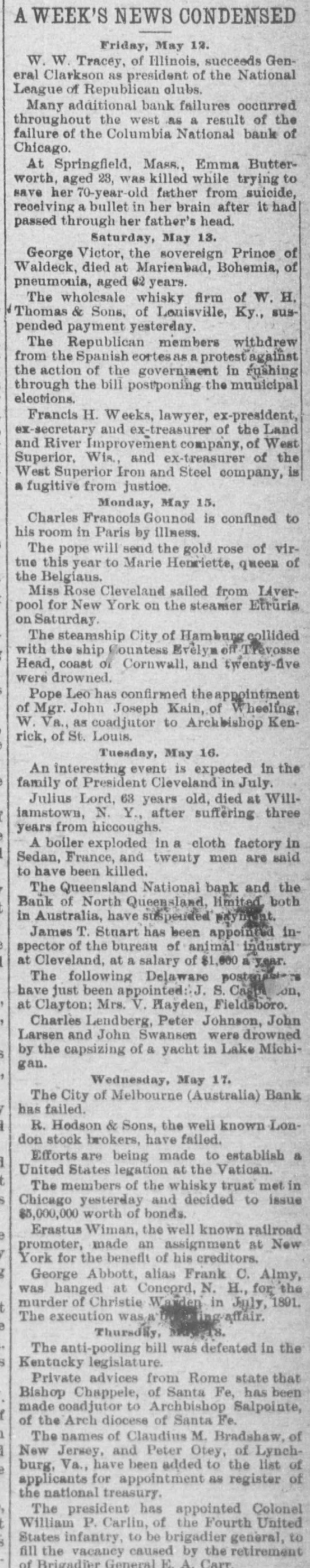A WEEK'S NEWS CONDENSED Friday, May 12. W. W. Tracey, of Illinois, succeeds General Clarkson as president of the National League of Republican olubs. Many additional bank failures occurred throughout the west as a result of the failure of the Columbia National bank of Chicago. At Springfield, Mass., Emma Butterworth, aged 23, was killed while trying to save her 70-year-old father from suicide, receiving a bullet in her brain after it had passed through her father's head. Saturday, May 13. George Victor, the sovereign Prince of Waldeck, died at Marienbad, Bohemia, of pneumonia, aged 62 years. The wholesale whisky firm of W. H. s Thomas & Sons, of Louisville, Ky., suspended payment yesterday. The Republican members withdrew from the Spanish eortes as a protest against the action of the government in rushing through the bill postponing the municipal elections. Francis H. Weeks, lawyer, ex-president, ex-secretary and ex-treasurer of the Land and River Improvement company, of West Superior, Wis., and ex-treasurer of the West Superior Iron and Steel company, is a fugitive from justice. Monday, May 15. Charles Francois Gounod is confined to his room in Paris by illness. The pope will send the gold rose of virtue this year to Marie Henriette, queen of the Belgiaus. Miss Rose Cleveland sailed from LAverpool for New York on the steamer Etruria on Saturday The steamship City of Hamburg collided with the ship Countess Evelym off-Trevosse Head, coast OL Cornwall, and twenty-five were drowned. Pope Leo has confirmed the appointment of Mgr. John Joseph Kain, of Wheeling W. Va., as coadjutor to Archbishop Kenrick, of St. Louis. Tuesday, May 16. An interesting event is expected in the family of President Cleveland in July. Julius Lord, 63 years old, died at Williamstown, N. Y. after suffering three years from hiccoughs. A boiler exploded in a cloth factory in Sedan, France, and twenty men are said to have been killed. The Queensland National bank and the Bank of North Queensland, limited both in Australia, have suspended payment. James T. Stnart has been appointed inspector of the bureau of animal industry at Cleveland, at a salary of $1,000 a year. The following Delaware postage have just been appointed: J. S. Caspe on, at Clayton: Mrs. V. Hayden, Fieldsboro. Charles Lendberg, Peter Johnson, John Larsen and John Swansen were drowned by the capsizing of & yacht in Lake Michigan. Wednesday, May 17. The City of Melbourne (Australia) Bank has failed. R. Hodson & Sons, the well known London stock brokers, have failed. Efforts are being made to establish a United States legation at the Vatican. The members of the whisky trust met in Chicago yesterday and decided to issue $5,000,000 worth of bonds. Erastus Wiman, the well known railroad promoter, made an assignment at New York for the benefit of his creditors. George Abbott, alias Frank C. Almy, was hanged at Coneprd, N. H., for the murder of Christie Warden in July, 1891. The execution was ing affair. Thursdly, May 18. The anti-pooling bill was defeated in the Kentucky legislature. Private advices from Rome state that Bishop Chappele, of Santa Fe, has been made coadjutor to Archbishop Salpointe, of the Arch diocese of Santa Fe. The names of Claudins M. Bradshaw, of I New Jersey, and Peter Otey, of Lynchburg, Va., have been added to the list of applicants for appointment as register of the national treasury. The president has appointed Colonel William P. Carlin, of the Fourth United States infantry, to be brigadier general, to fill the vacaney caused by the retirement of Brigadier General Care