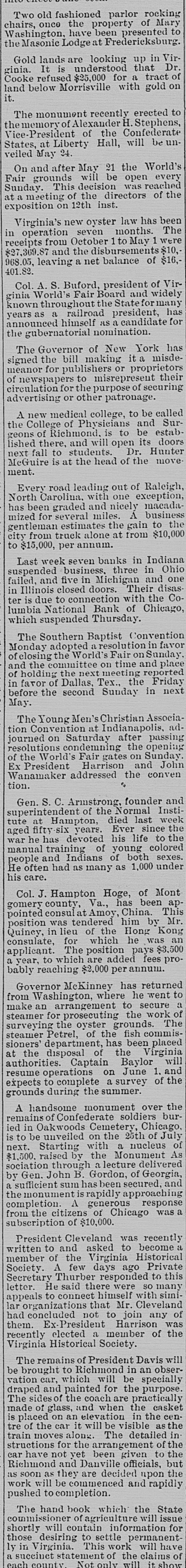 Two old fashioned parlor rocking chairs, once the property of Mary Washington, have been presented to the Masonic Lodge at Fredericksburg. Gold lands are looking up in Virginia. It is understood that Dr. Cooke refused $25,000 for a tract of land below Morrisville with gold on it. # ALEXANDER H. STEPHENS MONUMENT The monument recently erected to the memory of Alexander H. Stephens, Vice-President of the Confederate States, at Liberty Hall, will be unveiled May 24. On and after May 21 the World's Fair grounds will be open every Sunday. This decision was reached at a meeting of the directors of the exposition on 12th inst. Virginia's new oyster law has been in operation seven months. The receipts from October 1 to May 1 were $27,369.87 and the disbursements $10,968.05, leaving a net balance of $16,401.82. Col. A. S. Buford, president of Virginia World's Fair Board and widely known throughout the State for many years as a railroad president, has announced himself as a candidate for the gubernatorial nomination. The Governor of New York has signed the bill making it a misdemeanor for publishers or proprietors of newspapers to misrepresent their circulation for the purpose of securing advertising or other patronage. A new medical college, to be called the College of Physicians and Surgeons of Richmond, is to be established there, and will open its doors next fall to students. Dr. Hunter McGuire is at the head of the movement. Every road leading out of Raleigh, North Carolina, with one exception, has been graded and nicely macadamized for several miles. A business gentleman estimates the gain to the city from truck alone at from $10,000 to $15,000, per annum. Last week seven banks in Indiana suspended business, three in Ohio failed, and five in Michigan and one in Illinois closed doors. Their disaster is due to connection with the Columbia National Bank of Chicago, which suspended Thursday. The Southern Baptist Convention Monday adopted a resolution in favor of closing the World's Fair on Sunday, and the committee on time and place of holding the next meeting reported in favor of Dallas, Tex., the Friday before the second Sunday in next May. The Young Men's Christian Association Convention at Indianapolis, adjourned on Saturday after passing resolutions condemning the opening of the World's Fair gates on Sunday. Ex President Harrison and John Wanamaker addressed the convention. Gen. S. C. Armstrong, founder and superintendent of the Normal Institute at Hampton, died last week aged fifty-six years. Ever since the war he has devoted his life to the manual training of young colored people and Indians of both sexes. He often had as many as 1,000 under his care. Col. J. Hampton Hoge, of Montgomery county, Va., has been appointed consul at Amoy, China. This position was tendered him by Mr. Quincy, in lieu of the Hong Kong consulate, for which he was an applicant. The position pays $3,500 a year, to which are added fees probably reaching $2,000 per annum. Governor McKinney has returned from Washington, where he went to make an arrangement to secure a steamer for prosecuting the work of surveying the oyster grounds. The steamer Petrel, of the fish commissioners' department, has been placed at the disposal of the Virginia authorities. Captain Baylor will resume operations on June 1, and expects to complete a survey of the grounds during the summer. A handsome monument over the remains of Confederate soldiers buried in Oakwoods Cemetery, Chicago, is to be unveiled on the 25th of July next. Starting with a nucleus of $1,500, raised by the Monument Association through a lecture delivered by Gen. John B. Gordon, of Georgia, a sufficient sum has been secured, and the monument is rapidly approaching completion. A generous response from the citizens of Chicago was a subscription of $10,000. President Cleveland was recently written to and asked to become a member of the Virginia Historical Society. A few days ago Private Secretary Thurber responded to this letter. He said there were so many appeals to connect himself with similar organizations that Mr. Cleveland had concluded not to join any of them. Ex-President Harrison was recently elected a member of the Virginia Historical Society. The remains of President Davis will be brought to Richmond in an observation car, which will be specially draped and painted for the purpose. The sides of the coach are practically made of glass, and when the casket is placed on an elevation in the centre of the car it will be visible as the train moves along. The detailed instructions for the arrangement of the car have not yet been given to the Richmond and Danville officials, but as soon as they are decided upon the work will be commenced and rapidly pushed to completion. The hand book which the State commissioner of agriculture will issue shortly will contain information for those desiring to settle permanently in Virginia. This work will have a succinct statement of the claims of each county. Not only will it show