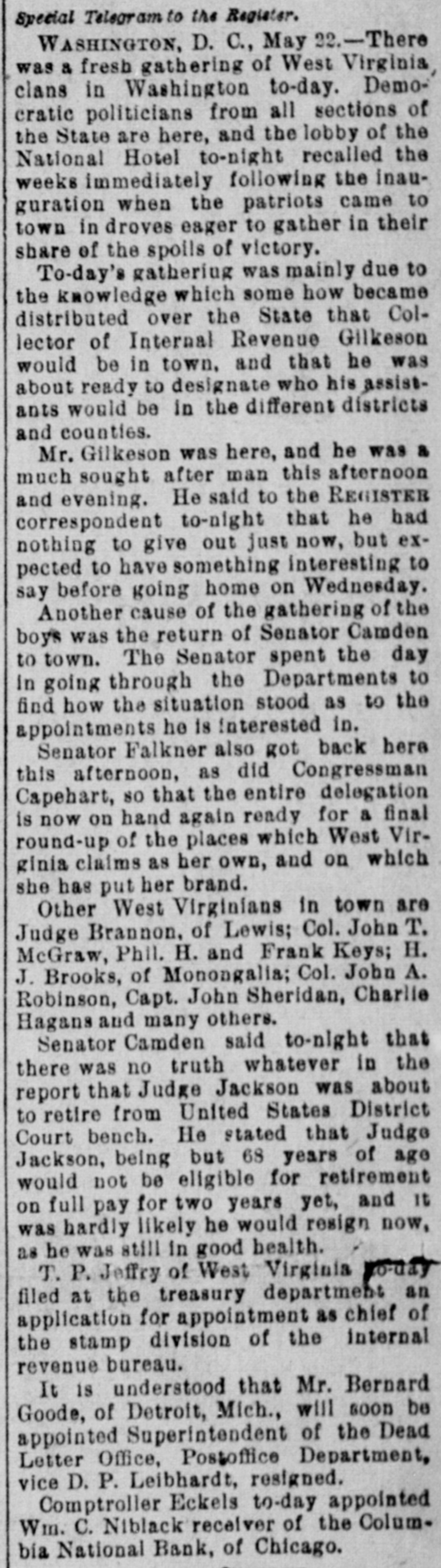 Special Telegram to the Register. WASHINGTON, D. C., May 22.-There was a fresh gathering of West Virginia clans in Washington to-day. Democratic politicians from all sections of the State are here, and the lobby of the National Hotel to-night recalled the weeks immediately following the inauguration when the patriots came to town in droves eager to gather in their share of the spoils of victory. To-day's gatheriug was mainly due to the knowledge which some how became distributed over the State that Collector of Internal Revenue Gilkeson would be in town, and that he was about ready to designate who his assistants would be in the different districts and counties. Mr. Gilkeson was here, and he was a much sought after man this afternoon and evening. He said to the REGISTER correspondent to-night that he had nothing to give out just now, but expected to have something interesting to say before going home on Wednesday. Another cause of the gathering of the boys was the return of Senator Camden to town. The Senator spent the day In going through the Departments to find how the situation stood as to the appointments he is Interested in. Senator Falkner also got back here this afternoon, as did Congressman Capehart, so that the entire delegation is now on hand again ready for a final round-up of the places which West Virginia claims as her own, and on which she has put her brand. Other West Virginians in town are Judge Brannon. of Lewis; Col. John T. McGraw, Phil. H. and Frank Keys; H. J. Brooks, of Monongalia; Col. John A. Robinson, Capt. John Sheridan, Charlie Hagans and many others. Senator Camden said to-night that there was no truth whatever in the report that Judge Jackson was about to retire from United States District Court bench. He stated that Judge Jackson, being but 68 years of age would not be eligible for retirement on full pay for two years yet, and it was hardly likely he would resign now, as he was still in good health. T. P. Jeffry of West Virginia Monday filed at the treasury department an application for appointment as chief of the stamp division of the Internal revenue bureau. It is understood that Mr. Bernard Goode, of Detroit, Mich., will soon be appointed Superintendent of the Dead Letter Office, Postoffice Department, vice D. P. Leibhardt, resigned. Comptroller Eckels to-day appointed Wm. C. Niblack receiver of the Columbia National Bank, of Chicago.
