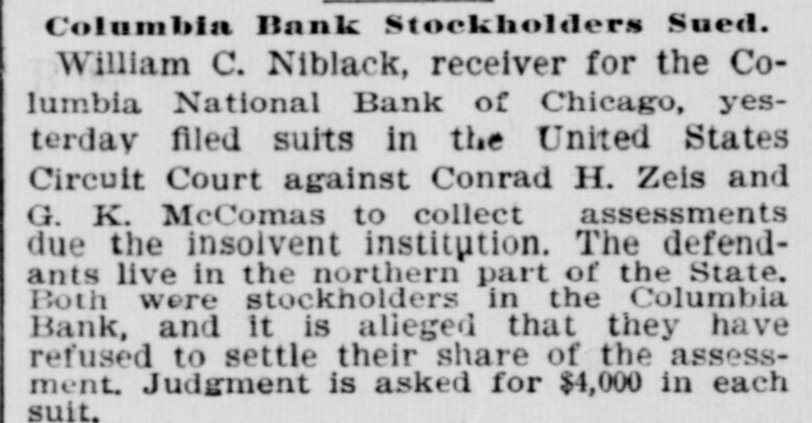 # Columbia Bank Stockholders Sued. William C. Niblack, receiver for the Columbia National Bank of Chicago, yesterday filed suits in the United States Circuit Court against Conrad H. Zeis and G. K. McComas to collect assessments due the insolvent institution. The defendants live in the northern part of the State. Both were stockholders in the Columbia Bank, and it is alleged that they have refused to settle their share of the assessment. Judgment is asked for $4,000 in each suit.