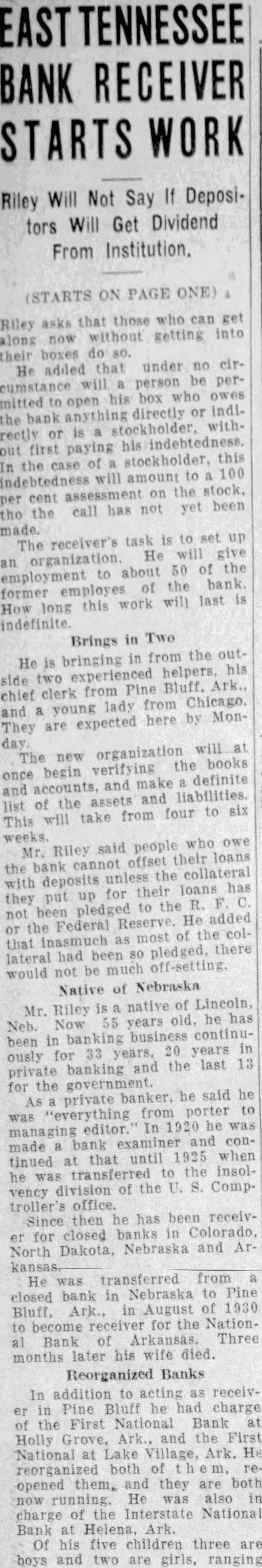 Mr. Riley is native of Lincoln, Neb. Now 55 years old. he has been in banking business continuously for 33 years, 20 years in private banking and the last 13 for As the private government. banker. he said he was "everything from porter to managing editor In 1920 he was made a bank examiner and continued at that until 1925 when he was transferred to the insolvency division of the U. S. Comptroller's office. Since then he has been receiver for closed banks in Colorado, North Dakota, Nebraska and ArHe was transferred from closed bank in Nebraska to Pine Bluff. Ark., in August of 1930 to become receiver for the National Bank of Arkansas. Three months later his wife died. Reorganized Banks