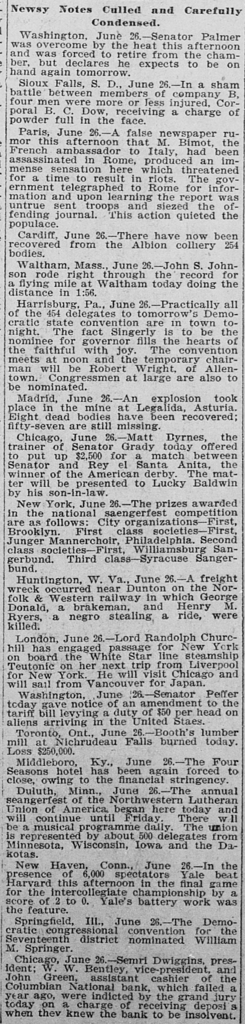 Newsy Notes Culled and Carefully Condensed. Washington, June 26.-Senator Palmer was overcome by the heat this afternoon and was forced to retire from the chamber, but declares he expects to be on hand again tomorrow. Sioux Falls, S. D., June 26.-In a sham battle between members of company B, four men were more or Jess injured, Corporal B. C. Dow, receiving a charge of powder full in the face. Paris, June 26.-A false newspaper rumor this afternoon that M. Bimot, the French ambassador to Italy, had been assassinated in Rome, produced an immense sensation here which threatened for a time to result in riots. The government telegraphed to Rome for information and upon learning the report was untrue sent troops and siezed the offending journal. This action quieted the populace. Cardiff, June 26.-There have now been recovered from the Albion colliery 254 bodies. Waltham, Mass., June 26.-John S. Johnson rode right through the record for a flying mile at Waltham today doing the distance in 1:56. Harrisburg, Pa., June 26.-Practically all of the 454 delegates to tomorrow's Democratic state convention are in town tonight. The fact Singerly is to be the nominee for governor fills the hearts of the faithful with joy. The convention meets at noon and the temporary chairman will be Robert Wright, of Allentown. Congressmen at large are also to be nominated. Madrid, June 26.-An explosion took place in the mine at Legalida, Asturia. Eight dead bodies have been recovered; fifty-seven are still missing. Chicago, June 26.-Matt Byrnes, the trainer of Senator Grady today offered to put up $2,500 for a match between Senator and Rey el Santa Anita, the winner of the American derby. The matter will be presented to Lucky Baldwin by his son-in-law. New York, June 26.-The prizes awarded in the national saengerfest competition are as follows: City organizations-First, Brooklyn. First class societies-First, Junger Mannerchoir, Philadelphia. Second class societies-First, Williamsburg Sangerbund. Third class-Syracuse Sangerbund. Huntington, W. Va., June 26.-A freight wreck occurred near Dunton on the Norfolk & Western railway in which George Donald, a brakeman, and Henry M. Ryers, a negro stealing a ride, were killed. London, June 26.-Lord Randolph Churchill has engaged passage for New York on board the White Star line steamship Teutonic on her next trip from Liverpool for New York. He will visit Chicago and will sail from Vancouver for Japan. Washington, June 26.-Semator Peffer today gave notice of an amendment to the tariff bill levying a duty of $50 per head on aliens arriving in the United Staes. Toronto, Ont., June 26.-Booth's lumber mill at Nichrudeau Falls burned today. Loss $250,000. Middleboro, Ky., June 26.-The Four Seasons hotel has been again forced to close, owing to the financial stringency. Duluth, Minn., June 26.-The annual seangerfest of the Northwestern Lutheran Union of America. began here today and will continue until Friday. There w.ll be a musical programme daily. The union is represented by about 500 delegates from Minnesota, Wisconsin, Iowa and the Dakotas. New Haven, Conn., June 26.-In the presence of 6,000 spectators Yale beat Harvard this afternoon in the final game for the intercollegiate championship by a score of 2 to 0. Yale's battery work was the feature. Springfield, III., June 26.-The Democratic congressional convention for the Seventeenth district nominated William M. Springer. Chicago, June 26.-Semri Dwiggins, president; W. W. Bentley, vice-president, and John Green, assistant cashier of the Columbian National bank, which failed a year ago, were indicted by the grand jury today on a charge of receiving deposi S when thev knew the bank to be insolvent.