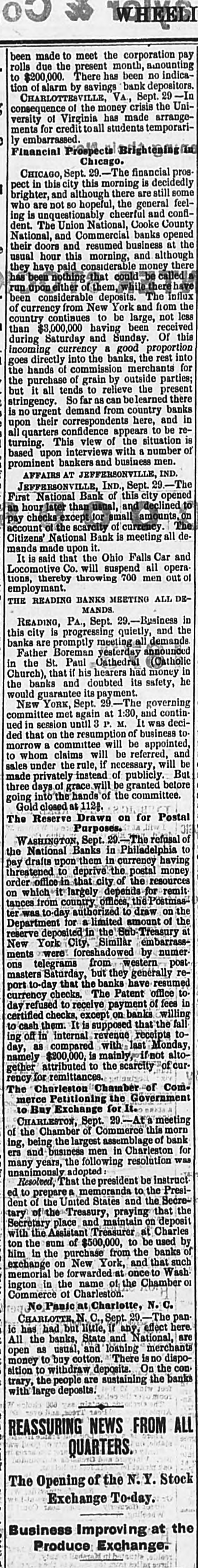 00 been made to meet the corporation pay rolls due the present month, amounting to $200,000 There has been no indication of alarm by savings bank depositors CHARLOTTESVILLE VA, Sept. 29 -In consequence of the money crisis the University of Virginia has made arrangements for credit toall students temporariembarrassed Financial Prospects Brightening Chicago. CHICAGO, Sept. 29. -The financial prospect in this city this morning is decidedly brighter, and although there are still some who are not so hopeful, the general feeling is unquestionably cheerful and confident. The Union National, Cooke County National, and Commercial banks opened their doors and resumed business at the usual hour this morning, and although they have paid considerable money there has been nothing that could called have run.upon either of them. while there been considerable deposits The influx of currency from New York and from the country continues to be large, not less than $3,000,000 having been received during Saturday and Sunday. Of this incoming currency a good proportion goes directly into the banks, the rest into the hands of commission merchants for the purchase of grain by outside parties; but it all tends to relieve the present stringency. So far as can belearned there is no urgent demand from country banks upon their correspondents here, and in all quarters confidence appears to be returning. This view of the situation is based upon interviews with a number of prominent bankers and business men. AFFAIRS AT JEFFERSONVILLE, IND. JEFFERSONVILLE, IND., Sept. 29.-The First National Bank of this city opened an hour later than usual, and declined to pay checks except for small mounts.or account of the scarcity of currency The Citizens' National Bank is meeting all de mands made upon it. It is said that the Ohio Falls Car and Locomotive Co. will suspend all opera tions, thereby throwing 700 men out of employment. THE READING BANKS MEETING ALL DEMANDS READING, PA. Sept. 29.-Business in this city is progressing quietly, and the banks are promptly meeting all demands Father Boreman yesterday announced in the St. Paul Cathedral (Catholic Church), that if his hearers had money in the banks and doubted its safety, he would guarantee its payment. NEW YORK, Sept. 29.-The governing committee met again at 1:30, and continued in session until 3 P. M. It was decided that on the resumption of business to morrow a committee will be appointed to whom claims will be referred, and sales under the rule, if necessary, will be made privately instead of publicly But three days of grace will be granted before going into the hands of the committee. Gold closed at 112g The Reserve Drawn on for Postal Purposes. WASHINGTON, Sept. -The refusal of the National Banks in Philadelphia to pay drafts upon them in currency having threatened to deprive the postal money order office in that city of the resources on which it largely depends for remit tances... from country offices, the Postmaster was o-day authorized to draw on the Department for a limited amount of the reserve deposited in the Stib: Treasury at New York City, Similar embarrass ments were foreshadowed by numer ons telegrams from western post masters Saturday, but they generally reto-day that the banks have resumed currency checks. The Patent office to day refused to receive payment of fees in certified checks, except on banks willing cash them. It is supposed that the fall ing off in internal revenue receipts today, as compared with last Monday, namely $200,000, is mainly, if not altogether attributed to the scarcity of currency for remittances. The Charleston Chamber of Com. merce Petitioning the Government to Buy Exchange for It. CHARLESTON, Sept. 20.-At a meeting of the Chamber of Commerce this morn ing, being the largest assemblage of bank ers and business men in Charleston for many years, the following resolution was unanimously adopted Resolved That the president be instruct ed to prepare a memoranda to the President of the United States and the Secretary of the Treasury, praying that the Secretary place and maintain on deposit with the Assistant Treasurer at Charles ton the sum of $500,000, to be used by him in the purchase from the banks of exchange on New York, and that such memorial be forwarded at oncet Wash ington in the name of the Chamber or Commerce of Charleston No Panic at Charlotte, N. C. CHARLOTTE, N.C. Sept. 29 The pan ic has had but little, If any, effect here All the banks, State and National, are open as usual, and loaning merchants money to buy cotton There isno disposition to withdraw deposite. On the con trary, the people are sustaining the banks with large deposits REASSURING NEWS FROM ALL QUARTERS. The Opening of the N.Y. Stock Exchange To-day. Business Improving at the Produce:Exchange.