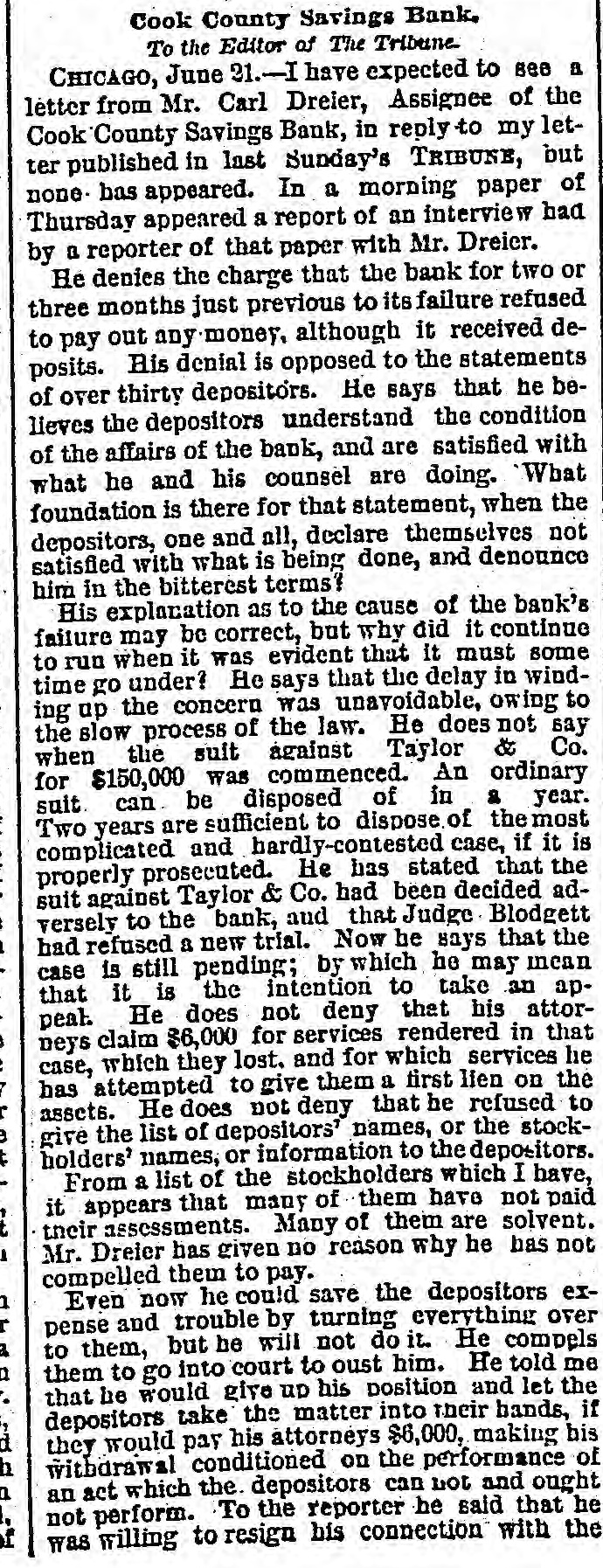 Cook County Savings Bank. To the Editor of The Tribune CHICAGO, June 31.-I have expected to see a letter from Mr. Carl Dreier, Assignee of the Cook County Savings Bank, in reply to my letter published in last Sunday's TRIBUNE, but none. has appeared. In a morning paper of Thursday appeared a report of an interview had by a reporter of that paper with Mr. Dreier. He denies the charge that the bank for two or three months just previous to its failure refused to pay out any money, although it received deposits. His denial is opposed to the statements of over thirty depositors. He says that he believes the depositors understand the condition of the affairs of the bank, and are satisfied with what he and his counsel are doing. 'What foundation is there for that statement, when the depositors, one and all, declare themselves not satisfied with what is being done, and denounce him in the bitterest terms? His explanation as to the cause of the bank's failure may be correct, but why did it continue to run when it was evident that it must some time go under? He says that the delay in winding up the concern was unavoidable, owing to the slow process of the law. He does not say when the suit against Taylor & Co. for $150,000 was commenced. An ordinary suit. can be disposed of in & year. Two years are sufficient to dispose, of the most complicated and hardly-contested case, if it is properly prosecuted. He has stated that the suit against Taylor & Co. had been decided adversely to the bank, and that Judge Blodgett had refused a new trial. Now he says that the case is still pending; by which he may mean that it is the intention to take an appeal. He does not deny that his attorneys claim $6,000 for services rendered in that case, which they lost. and for which services he has attempted to give them a first lien on the assets. He does not deny that he refused to give the list of depositors' names, or the stockholders' names, or information to the depositors. From a list of the stockholders which I have, it appears that many of them have not paid their assessments. Many of them are solvent. Mr. Dreier has given no reason why he has not compelled them to pay. Even now he could save the depositors expense and trouble by turning everything over to them, but be will not do it. He compels them to go into court to oust him. He told me that he would give up his position and let the depositors take the matter into their hands, if they would pay his attorneys $6,000, making his withdrawal conditioned on the performance of an act which the depositors can not and ought not perform. To the reporter he said that he was willing to resign his connection with the