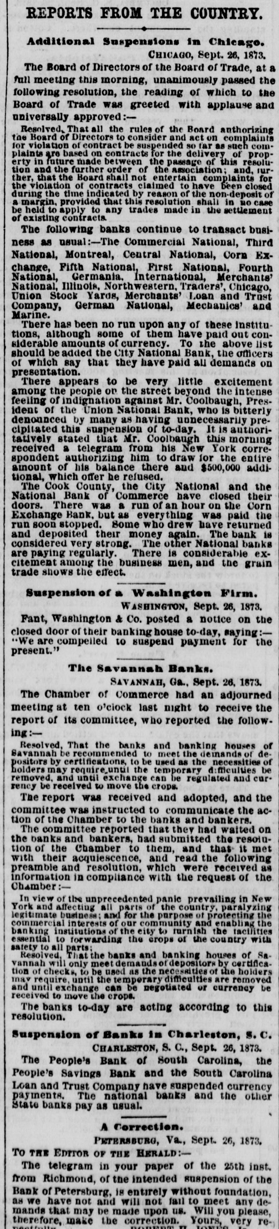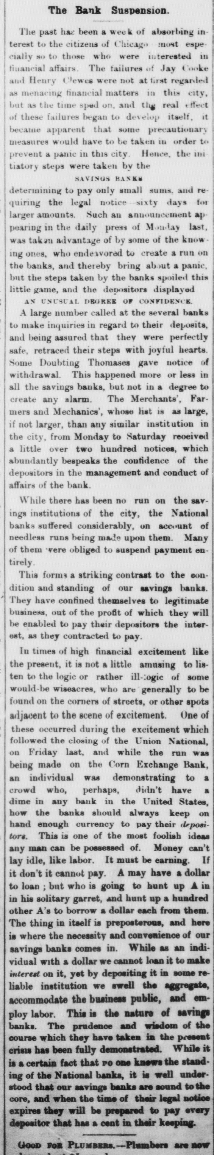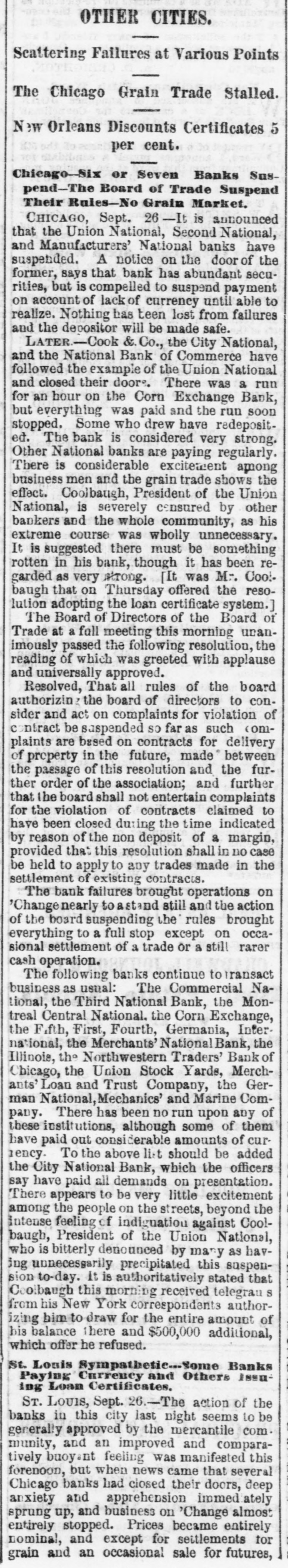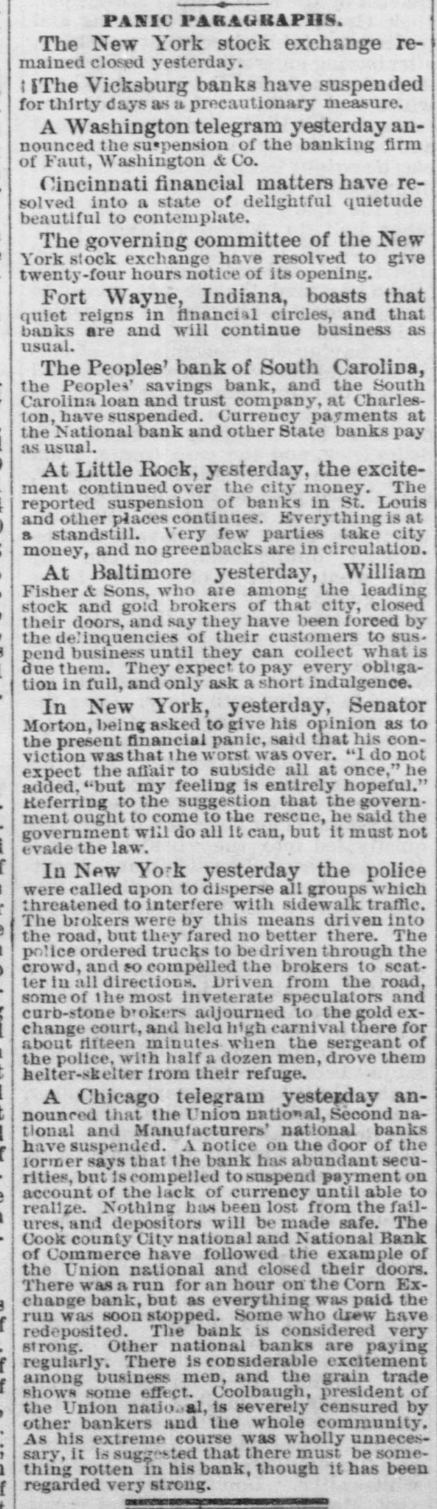 PANIC PARAGRAPHS. The New York stock exchange remained closed yesterday. I IThe Vicksburg banks have suspended for thirty days as a precautionary measure. A Washington telegram yesterday announced the suspension of the banking firm of Faut, Washington & Co. Cincinnati financial matters have resolved into a state of delightful quietude beautiful to contemplate. The governing committee of the New York stock exchange have resolved to give twenty-four hours notice of its opening. Fort Wayne, Indiana, boasts that quiet reigns in financial circles, and that banks are and will continue business as usual. The Peoples' bank of South Carolina, the Peoples' savings bank, and the South Carolina loan and trust company, at Charleston, have suspended. Currency payments at the National bank and other State banks pay as usual. At Little Rock, yesterday, the excitement continued over the city money. The reported suspension of banks in St. Louis and other places continues. Everything is at a standstill. Very few parties take city money, and no greenbacks are in circulation. At Baltimore yesterday, William Fisher & Sons, who are among the leading stock and gold brokers of that city, closed their doors, and say they have been forced by the delinquencies of their customers to suspend business until they can collect what is due them. They expect to pay every obligation in full, and only ask a short indulgence. In New York, yesterday, Senator Morton, being asked to give his opinion as to the present financial panic, said that his conviction was that the worst was over. "I do not expect the affair to subside all at once," he added, "but my feeling is entirely hopeful." Referring to the suggestion that the government ought to come to the reseue, he said the government will do all It can, but it must not evade the law. In New York yesterday the police were called upon to disperse all groups which threatened to interfere with sidewalk traffic. The brokers were by this means driven into the road, but they fared no better there. The police ordered trucks to be driven through the crowd, and so compelled the brokers to scatter in all directions. Driven from the road, some of the most inveterate speculators and curb-stone brokers adjourned to the gold exchange court, and held high carnival there for about rifteen minutes when the sergeant of the police, with half a dozen men, drove them helter-skelter from their refuge. A Chicago telegram yesterday announced that the Union national, Second national and Manufacturers' national banks have suspended. A notice on the door of the former says that the bank has abundant securities, but is compelled to suspend payment on account of the lack of currency until able to realize. Nothing has been lost from the failures, and depositors will be made safe. The Cook county City national and National Bank of Commerce have followed the example of the Union national and closed their doors. There was a run for an hour on the Corn Exchange bank, but as everything was paid the run was soon stopped. Some who drew have redeposited. The bank is considered very strong. Other national banks are paying regularly. There is considerable excitement among business men, and the grain trade shows some effect. Coolbaugh, president of the Union national, is severely censured by other bankers and the whole community, As his extreme course was wholly unnecessary, it is suggested that there must be something rotten in his bank, though it has been regarded very strong.