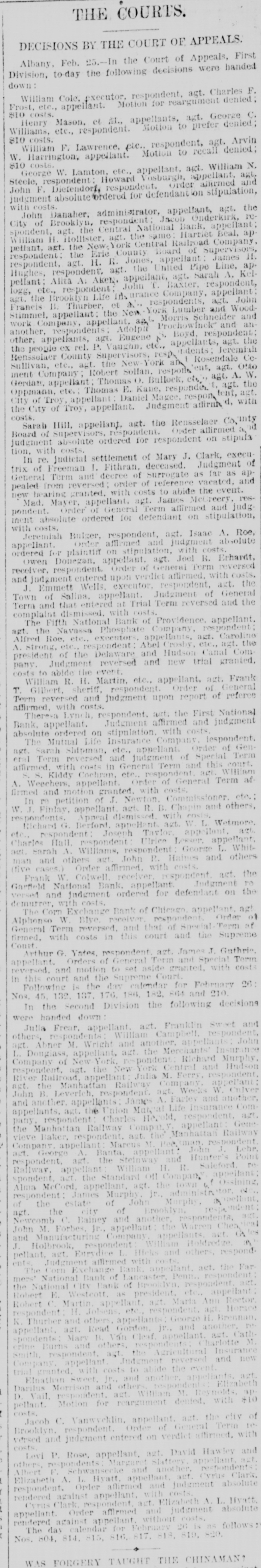 Steele, respondent Howard Vosburgh, John F. Diefendorf, respondent. Order judgment absolute ordered for defendant with costs. John Danaher, administrator, appell City of Brookly 11, respondent Jacob spondent, agt. the Central National Bar William H. Hollister, age. the same Has petiant, agt. the New York Central Railr respondent: the Erie County Board of respondent, agt. H. R. Jones, appellar Hughes, respondent, agt. the Inited L' pellant; Alita A. AKCN, appellant, agt. 10gg, etc., respondent John 1. Baxter agt. the Brookly Life Ins urance Compa Francis B. Thurber, ot and responden stimmel, appellant: the New York Lumb work Company, appellant, ag. Morris another, respondents Adolph Prochow other, appellants, agt. Eugene &" Boyd the people ex rel. P. Vaughn, etc., appel rade Rensselaer County Supervisors, resp. Sullivan, etc., agt. the New York an ment Company; Robert Sollan, respons Gerdan, appellant: Thomas O. Bullock, et Oppmann, ete.: Thomas E. Kane, respond ity of Troy appellant Daniel Magee, res the City or Troy, appellant. Judgment costs. Sarah Hill, appellant, agt. the Renss Board of Supervisors, réspondent. Order judgment absolute ordered for responder tion, with costs. In re. judicial settlement of Mary J. trix of Freeman 1. Fithran. deceased. General Term and decree of Surrogate pealed from reversed; order of reference new hearing granted. with costs to abide Mad. Mayer, appellant, agt. James pondent. Order of General Term affirm ment absolute ordered for defendant of with costs. Jeremiah Bulger, respondent, agt. I appellant. Order affirmed and judgn ordered for plaintiff on stipulation, with Owen Donegan. appellant, agt. Joel receiver, respondent. Order of General and judgment entered upon verdict affirm J. Emmett Wells. executor. respond Town of Salina, appellant. Judgment Term and that entered at Trial Term rev complaint dismissed. with costs. The Fifth National Bank of Providen agt. the Navassa Phosphate Company, Alfred Roe. etc., executors. appellants, A. Strong. etc., respondent: Abel Crosby, president of the Delaware and Hudson pany. Judgment reversed and new costs in abide the event. William R. H. Martin. etc., appellan T. Glibert. sheriff. respondent. Order Term reversed and judgment upon rep affirmed, with costs. Theresa Lynch, respondent, ast: the ) Bank, appellant. Judgment affirmed absolute ordered on stipulation. with co The Mutual Life Insurance Company agt. Sarah Shipman, etc., appellant. eral Term reversed and judgment of affirmed. with costs in General Term an Kiddy Cochran. etc. respondent 1. Weechers. appellant. Order of Gens firmed and motion granted. with costs. In re petition of J. Newton. Comm W J. Finlay, appellant. agt. R. B. Chapi respondents. Appeal dismissed. with or Richard G. Berford appeHant azt. W etc respondent Joseph Tavlor ap harles Hall. respondent Ulrice Less net. Sarah A. Williams. respondent Ge man and others agt John R. Haine five cases.) Order affirmed. with costs Frank W. Colwell receiver respond Garfield National Bank. appellant. versed and judgment ordered for defer demurrer, with costs. The Corn Exchange Bank of Chicago Alphonso W Blve receiver responder General Term reversed. and that of Sine firmed. with costs in this court and Court Arthur G. Yates. respondent ast. Jam appellant. Orders of General Term and reversed. and motion to set aside grante in this court and the Supreme Court. Following is the day catendar for Nos. 45. 132. 187. 176. 186, 182, 864 a In the Second Division the follow were handed down: Julia Frear, appellant. agt. Frankli others, respondents William Campbel 1Rt. Abner M. Wright and another, apt L. Douglass, appellant, agt the Mercha Company of New York, pondent Rie respondent, ngt. the New York Central River Railroad, appellant Julia M Ferr ngt. the Manhattan Railway Compan John B. Leverich. respondent. agt. We and another, appellants James A. Farle appellants, agt. the Union Mut at Life I pany respondent Charles Hegold, res the Manhattan Railway Company ap: vieve Baker, respondent. ast the Manh Company appellant Marcus M Beckma art George A Banta, appellant. respondent, agt the Steinway and I Railway, appellant William 11. R. pondent act the Standard Off Compat Alma McCord, appellant, agt. the town respondent: James Murphy jr. admin of the estate of John Murph ngt. the city of Brooklyn Newcomb C. Bainey and another rest John M Forbes Jr., appellant the Wa and Manufacturing Company appellan J. Holbrook, respondent William H pellant, agt Eurydice Hicks and ot Judgment affirmed with costs. ents. The Corn Exchange Bank appellant. mers' National Bank of Lancaster, Penn the National City Bank of Brooklyn, res Robert E. Westcott. as president, etc Robert Martin appellant, agt Maria respondent 11 Jolsens etc., respondent K Thurber and others appellants Georg appellant. agt. Read Gordon. jr., and pondents Mary B. Van Cleaf appellar rine Burns and others. respondents Smith, respondent. agt the Agriculto Company appellant Indement rever trial granted. with costs to abide the e Elnathan Sweet, Jr., and another, Darilus Morrison and other responder D. Vail. respondent. agt William M pellant. Motion for reargument denis costs. Jacob C. Vanwycklin, appellant. agt Brooklyn, respondent. Order of Gene versed and judgment entered on verdict