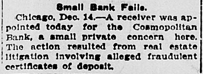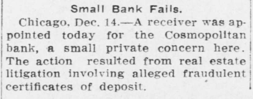 Small Bank Fails. Chicago, Dec. 14.-A receiver was appointed today for the Cosmopolitan Bank, a small private concern here. The action resulted from real estate litigation involving alleged fraudulent certificates of deposit.
