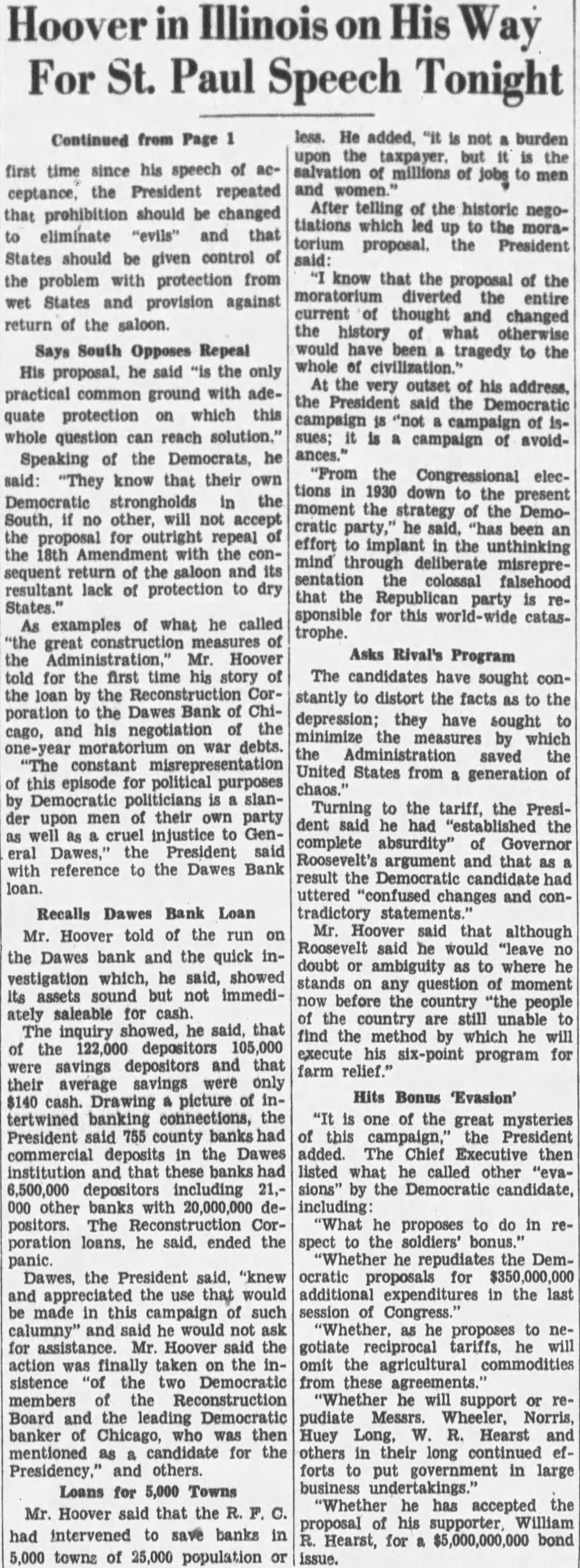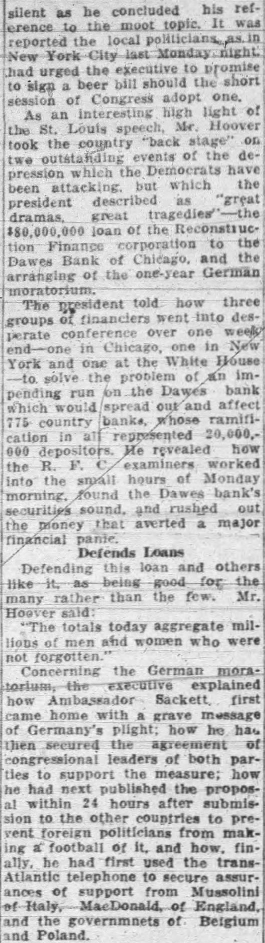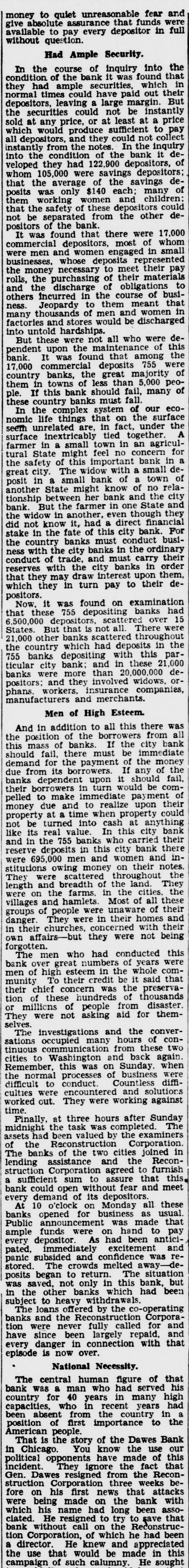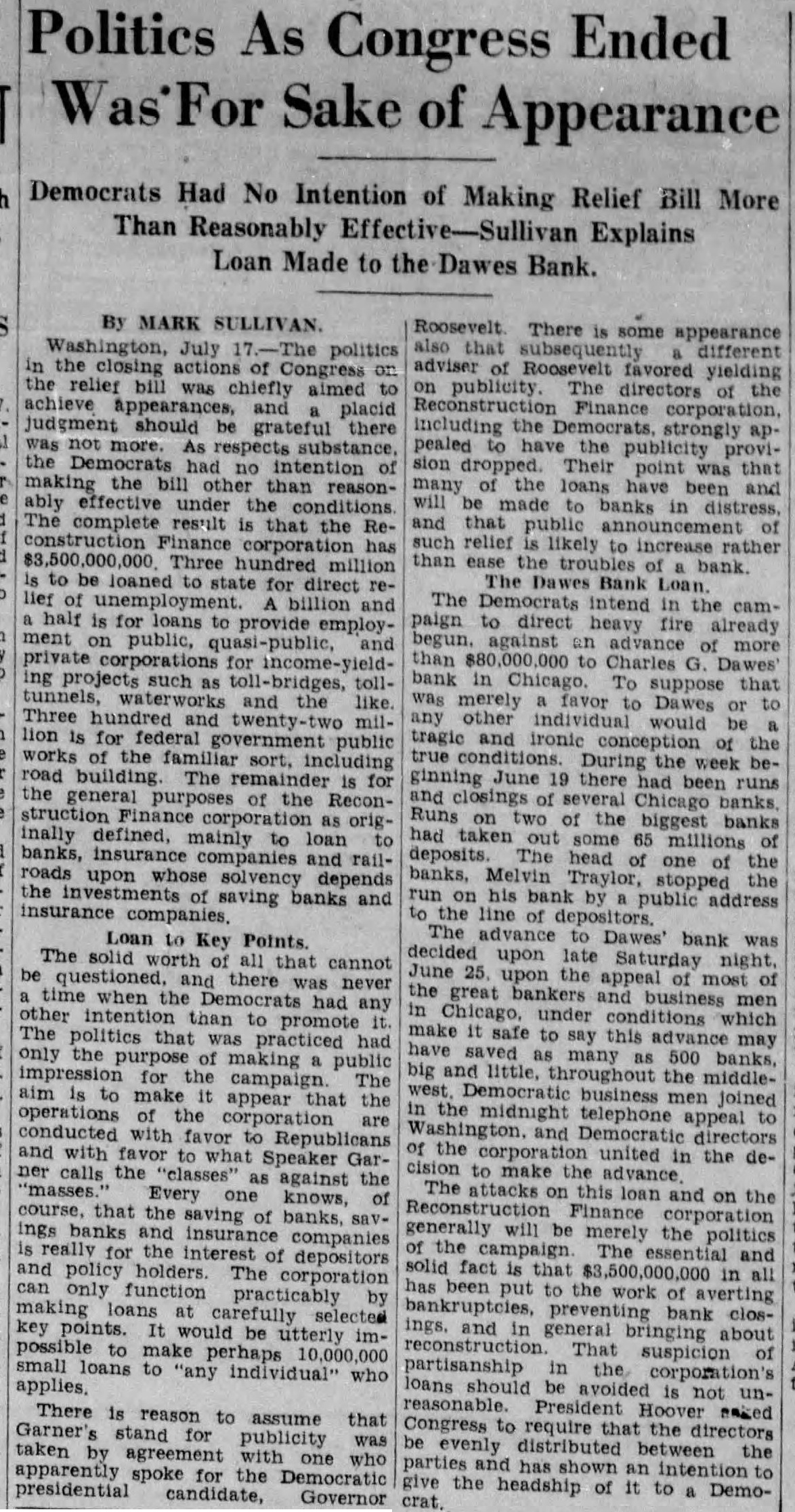 Politics As Congress Ended Sake of Appearance Democrats Had No Intention of Making Relief Bill More Than Reasonably Effective-Sullivan Explains Loan Made to the Dawes Bank. By MARK SULLIVAN. July politics the closing of Congress was aimed placid should be grateful there As no intention the than reasoneffective the complete result the Reconstruction Finance corporation has Three hundred to be loaned for direct billion and for to provide employpublic, for projects such bridges, and the like hundred and twenty for government public general of the defined, mainly to insurance companies railand solvency depends saving banks Loan to Key Points. cannot there when the had than to politics that practiced purpose making the campaign to appear the of conducted with Republicans and with to what Speaker Garthe "classes" as against the Every knows, that of banks, savand insurance companies the interest of depositors holders The function practicably points. would be utterly imloans individual" who There is to assume that publicity one apparently spoke for the Democratic candidate, Governor Roosevelt There is some appearance also that different Roosevelt favored yielding publicity. directors the Finance including the strongly pealed have the sion point was will and that relief rather than the bank The intend the to heavy fire already than to Charles bank suppose was merely favor Dawes other individual would conception the During the week had Chicago the biggest banks had taken 65 millions deposits. The one of the stopped run his address the line of to bank decided upon late Saturday June the the bankers and in conditions to this as 500 banks, big and throughout the middlebusiness the midnight telephone appeal and Democratic the corporation united in the deto The attacks this and on the generally merely the politics the and solid fact that in all has been put averting preventing closand in general bringing suspicion partisanship corporation's loans should unPresident Congress to require the directors evenly distributed between the intention give the headship of to Democrat.