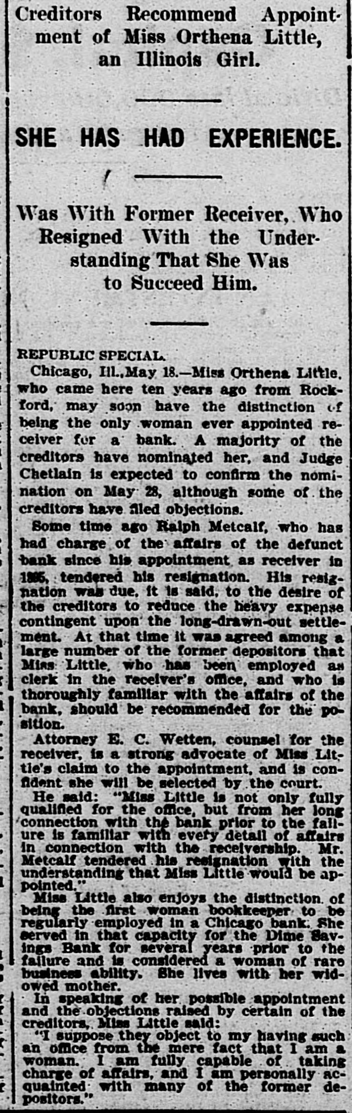 Creditors Recommend Appointment of Miss Orthena Little, an Illinois Girl. # SHE HAS HAD EXPERIENCE. Was With Former Receiver, Who Resigned With the Understanding That She Was to Succeed Him. REPUBLIC SPECIAL Chicago, Ill., May 18.-Miss Orthena Little, who came here ten years ago from Rockford, may soon have the distinction of being the only woman ever appointed receiver for a bank. A majority of the creditors have nominated her, and Judge Chetlain is expected to confirm the nomination on May 28, although some of the creditors have filed objections. Some time ago Ralph Metcalf, who has had charge of the affairs of the defunct bank since his appointment as receiver in 1885, tendered his resignation. His resignation was due, it is said, to the desire of the creditors to reduce the heavy expense contingent upon the long-drawn-out settlement. At that time it was agreed among a large number of the former depositors that Miss Little, who has been employed as clerk in the receiver's office, and who is thoroughly familiar with the affairs of the bank, should be recommended for the position. Attorney E. C. Wetten, counsel for the receiver, is a strong advocate of Miss Little's claim to the appointment, and is confident she will be selected by the court. He said: "Miss Little is not only fully qualified for the office, but from her long connection with the bank prior to the failure is familiar with every detail of affairs in connection with the receivership. Mr. Metcalf tendered his resignation with the understanding that Miss Little would be appointed." Miss Little also enjoys the distinction of being the first woman bookkeeper to be regularly employed in a Chicago bank. She served in that capacity for the Dime Savings Bank for several years prior to the failure and is considered a woman of rare business ability. She lives with her widowed mother. In speaking of her possible appointment and the objections raised by certain of the creditors, Miss Little said: "I suppose they object to my having such an office from the mere fact that I am a woman. I am fully capable of taking charge of affairs, and I am personally acquainted with many of the former depositors."
