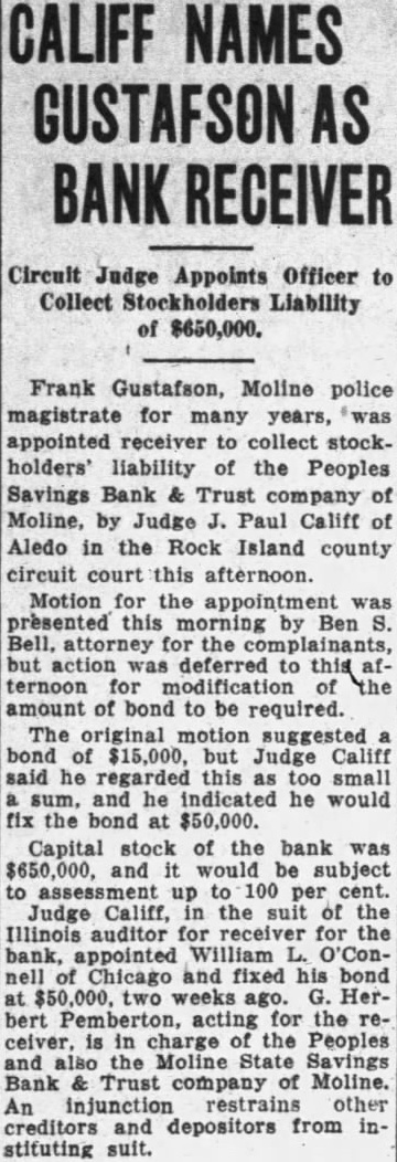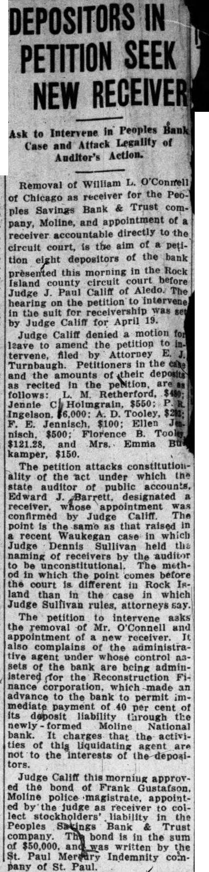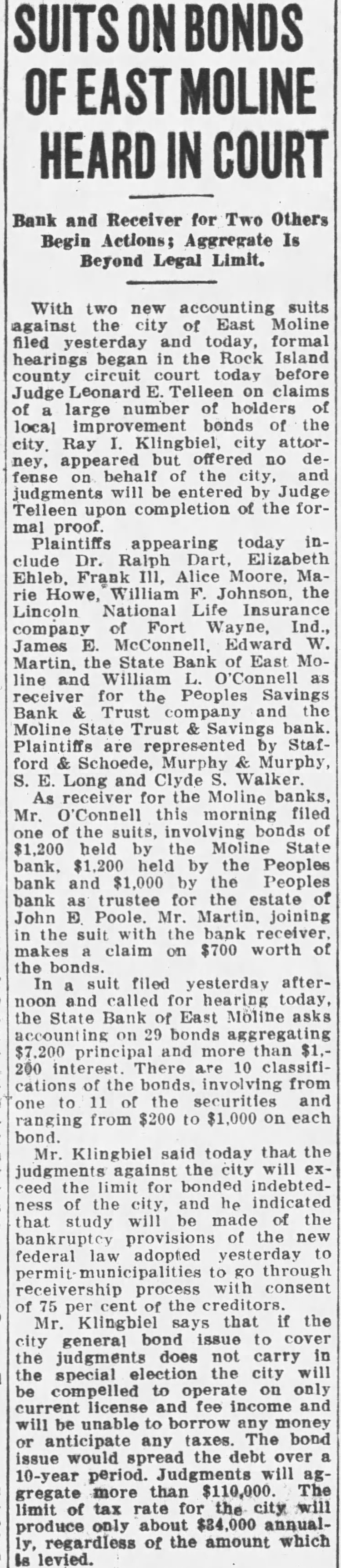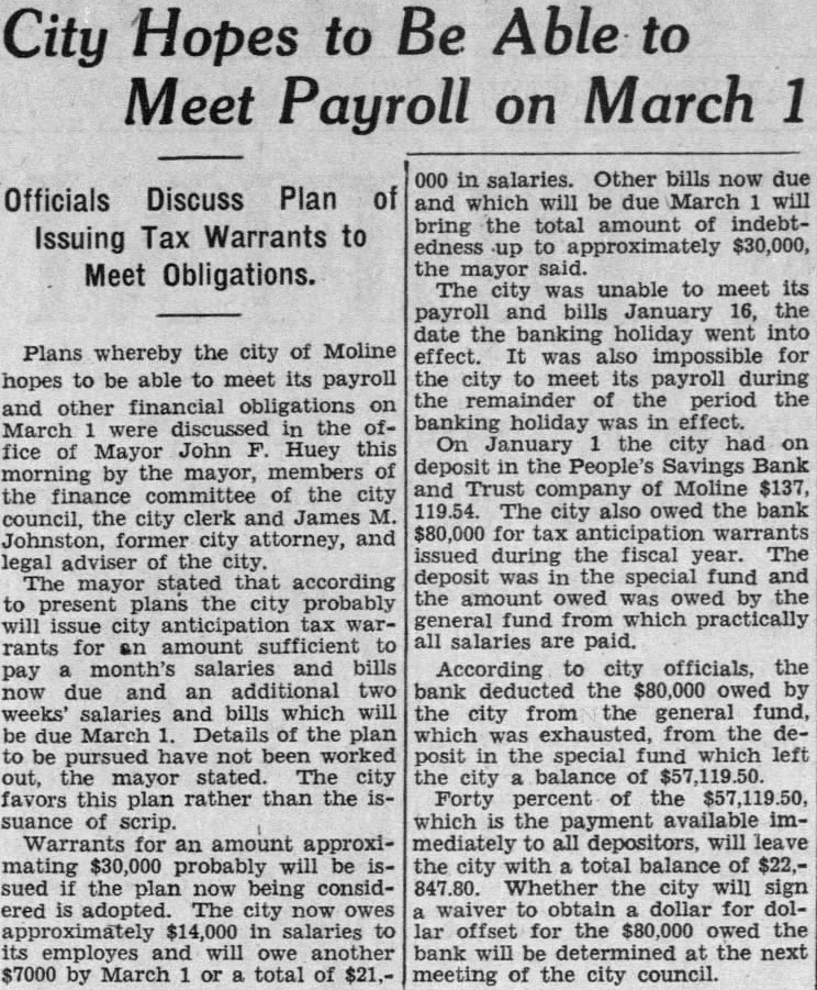 Be to City Hopes to Meet March Payroll on Officials Discuss Plan Issuing Tax Warrants to Meet Obligations. Plans whereby the city of Moline hopes to be able to meet its payroll and other financial obligations on March were in the office of Mayor John Huey this the mayor, of morning by the committee of the city council, the city clerk and James Johnston, former city attorney, and legal adviser the city. The mayor stated that according to present plans the city probably will issue city anticipation warrants for amount sufficient month's salaries and bills pay now due and an additional two salaries and bills which will due March Details of the plan to be pursued have not been worked out, the mayor stated. The city favors this plan rather than the suance of scrip. Warrants for an amount approximating probably will be sued the plan now being considered is adopted. The now owes $14,000 in salaries to and will owe another $7000 by March or total of in salaries. Other bills now due and which will be due March will bring the total amount of indebtedness up approximately $30,000, the mayor said. The city was unable to meet its payroll and bills January 16, the date the banking holiday went into effect. was also impossible for the city to meet its payroll during the remainder of the period the banking holiday was in effect. On January the city had deposit in the People's Savings Bank and Trust company of Moline $137, The city also the bank for tax issued during the fiscal The deposit was in the special fund and the owed was by the general fund from which practically salaries are paid. According to city officials, the bank deducted the owed by the city from the general fund, which was from the posit in the special fund which left city balance of Forty percent of the which the payment immediately all depositors, will the city with total balance of Whether the city will sign waiver to obtain dollar for doloffset the owed the bank will be determined at the next meeting of the city council.
