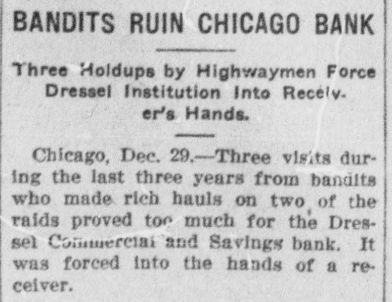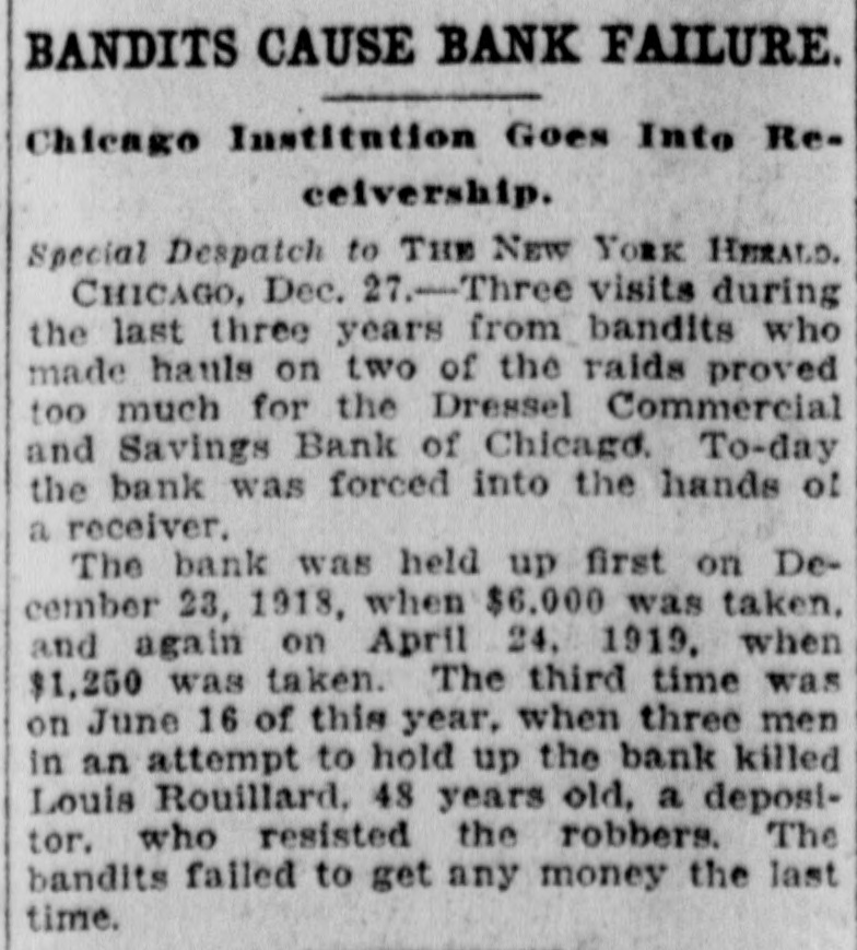 BANDITS CAUSE BANK FAILURE. Chicago Institution Goes Into Receivership. Special Despatch to THE NEW YORK HERALD. CHICAGO, Dec. 27.-Three visits during the last three years from bandits who made hauls on two of the raids proved too much for the Dressel Commercial and Savings Bank of Chicago. To-day the bank was forced into the hands of a receiver. The bank was held up first on December 23, 1918, when $6,000 was taken. and again on April 24, 1919, when $1,250 was taken. The third time was on June 16 of this year, when three men in an attempt to hold up the bank killed Louis Rouillard, 48 years old, a depositor. who resisted the robbers. The bandits failed to get any money the last time.