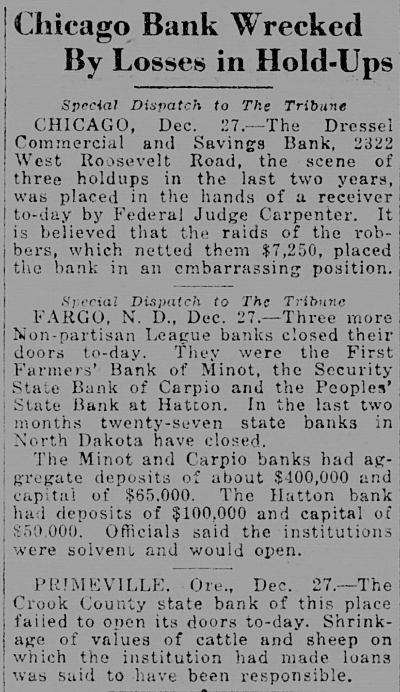 Chicago Bank Wrecked By Losses in Hold-Ups Special Dispatch to The Tribune CHICAGO, Dec. 27.-The Dressel Commercial and Savings Bank, 2322 West Roosevelt Road, the scene of three holdups in the last two years, was placed in the hands of a receiver to-day by Federal Judge Carpenter. It is believed that the raids of the robbers, which netted them $7,250, placed the bank in an embarrassing position. Special Dispatch to The Tribune FARGO, N. D., Dec. 37.-Three more Non-partisan League banks closed their doors to-day. They were the First Farmers' Bank of Minot, the Security State Bank of Carpio and the Peoples' State Bank at Hatton. In the last two months twenty-seven state banks in North Dakota have closed. The Minot and Carpio banks had aggregate deposits of about $400,000 and capital of $65.000. The Hatton bank had deposits of $100,000 and capital of $50,000. Officials said the institutions were solvent and would open. PRIMEVILLE. Ore., Dec. 27.-The Crook County state bank of this place failed to open its doors to-day. Shrinkage of values of cattle and sheep on which the institution had made loans was said to have been responsible.
