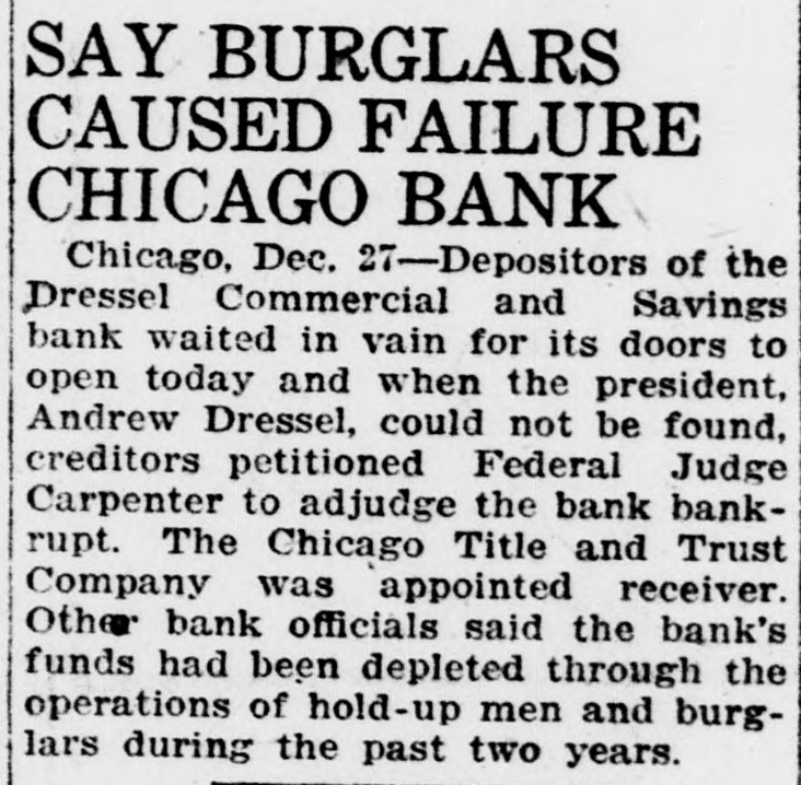 SAY BURGLARS CAUSED FAILURE CHICAGO BANK Chicago, Dec. 27-Depositors of the Dressel Commercial and Savings bank waited in vain for its doors to open today and when the president, Andrew Dressel, could not be found, creditors petitioned Federal Judge Carpenter to adjudge the bank bankrupt. The Chicago Title and Trust Company was appointed receiver. Other bank officials said the bank's funds had been depleted through the operations of hold-up men and burglars during the past two years.