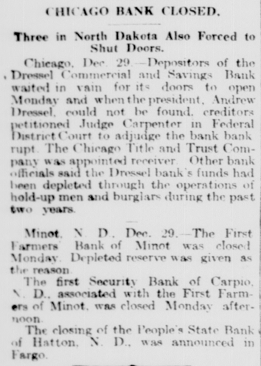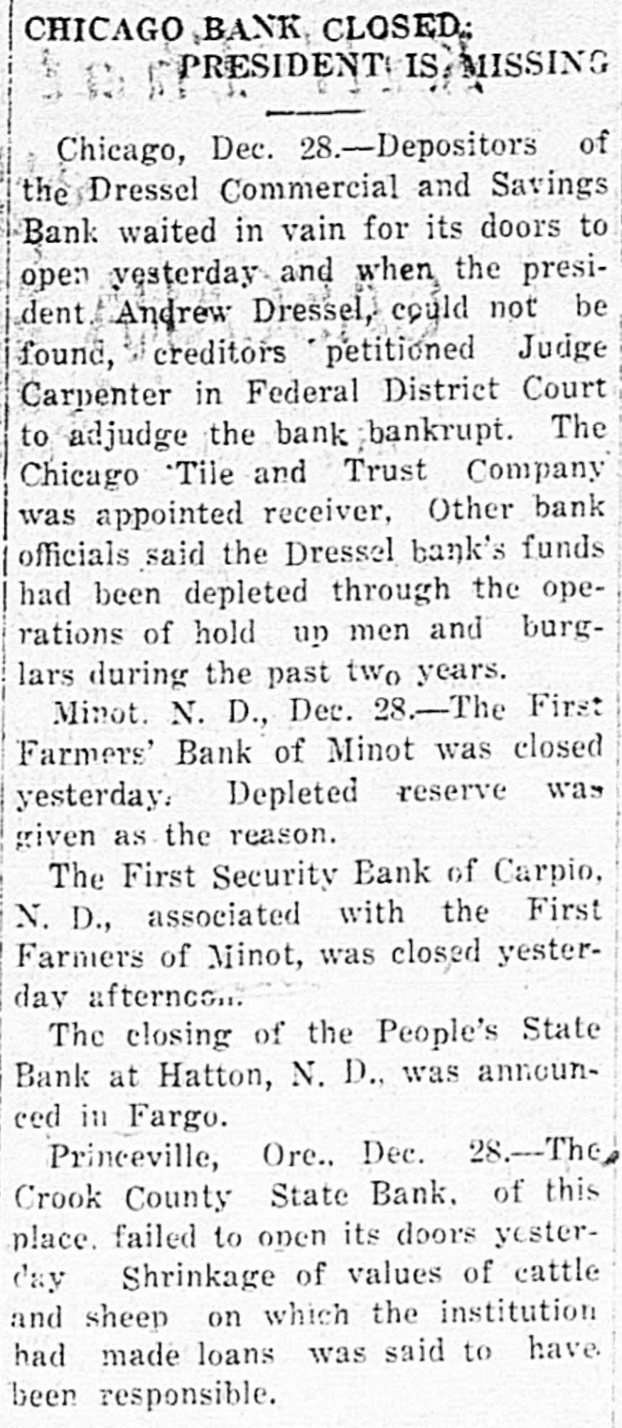 CHICAGO BANK CLOSED; PRESIDENT IS MISSING Chicago, Dec. 28.-Depositors of the Dressel Commercial and Savings Bank waited in vain for its doors to open vesterday and when the president Andrew Dressel, could not be found, creditors petitioned Judge Carpenter in Federal District Court to adjudge the bank bankrupt. The Chicago Tile and Trust Company was appointed receiver, Other bank officials said the Dressel bank's funds had been depleted through the operations of hold un men and burglars during the past two years. Minot. N. D., Dec. 28.-The First Farmers' Bank of Minot was closed yesterday. Depleted reserve was given as the reason. The First Security Bank of Carpio, N. D., associated with the First Farmers of Minot, was closed yesterday afternoon. The closing of the People's State Bank at Hatton, N. D., was announced in Fargo. Princeville, Ore., Dec. 28.-The Crook County State Bank. of this place. failed to open its doors yesterday Shrinkage of values of cattle and sheep on which the institution had made loans was said to have been responsible.