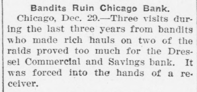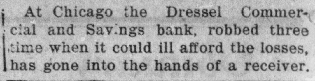 At Chicago the Dressel Commercial and Savings bank, robbed three time when it could ill afford the losses, has gone into the hands of a receiver.