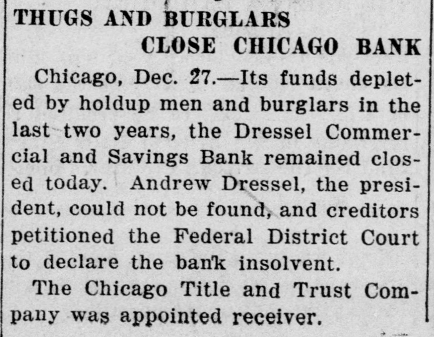 THUGS AND BURGLARS CLOSE CHICAGO BANK Chicago, Dec. 27.-Its funds depleted by holdup men and burglars in the last two years, the Dressel Commercial and Savings Bank remained closed today. Andrew Dressel, the president, could not be found, and creditors petitioned the Federal District Court to declare the bank insolvent. The Chicago Title and Trust Company was appointed receiver.