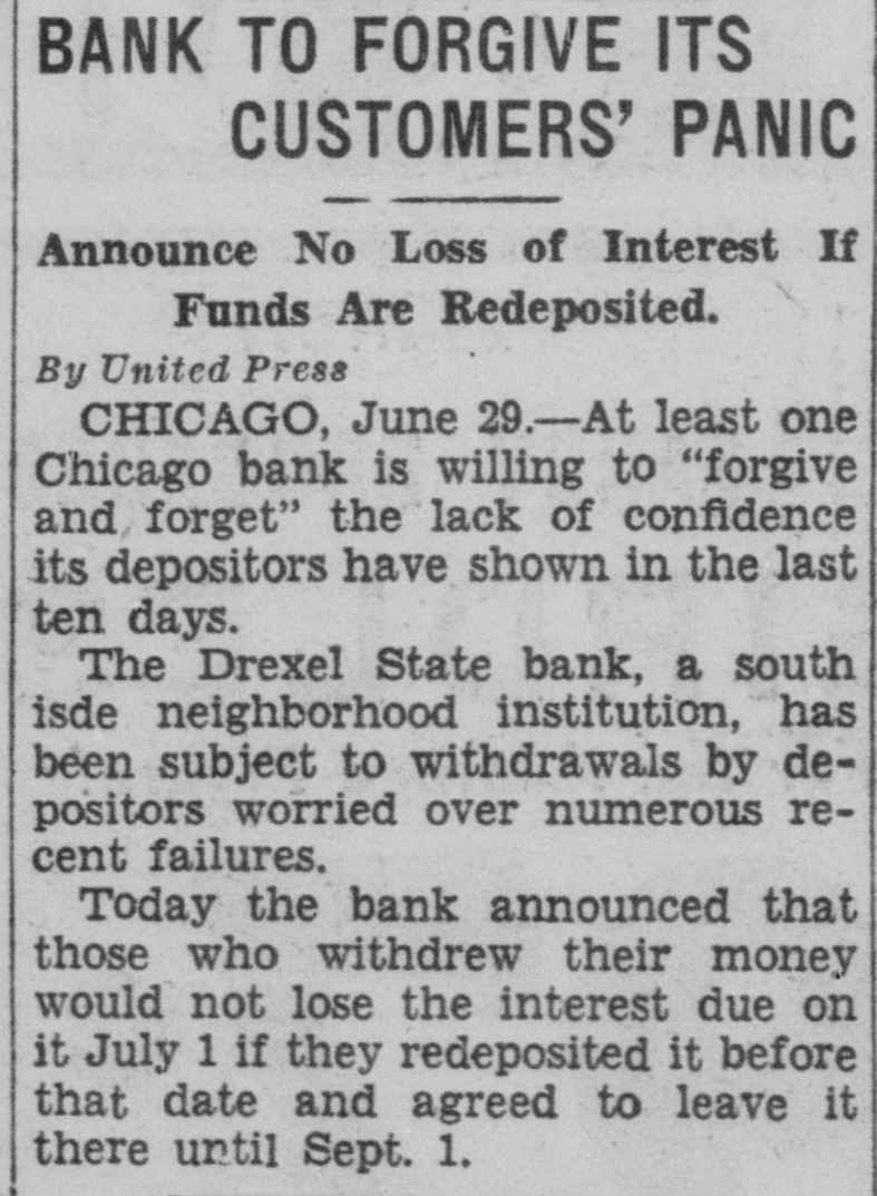 BANK TO FORGIVE ITS CUSTOMERS' PANIC Announce No Loss of Interest If Funds Are Redeposited. By United Press CHICAGO, June 29.-At least one Chicago bank is willing to "forgive and forget" the lack of confidence its depositors have shown in the last ten days. The Drexel State bank, a south isde neighborhood institution, has been subject to withdrawals by depositors worried over numerous recent failures. Today the bank announced that those who withdrew their money would not lose the interest due on it July 1 if they redeposited it before that date and agreed to leave it there until Sept. 1.