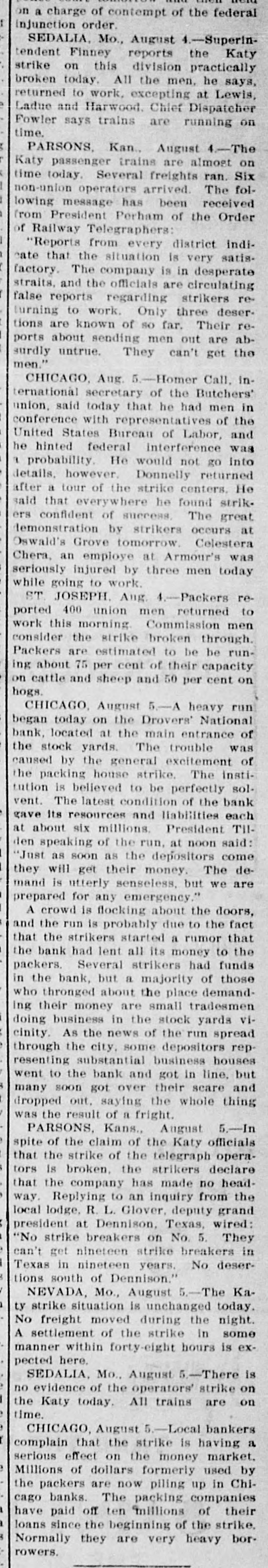 strike on this division practically broken today. All the men, he says, returned to work, excepting at Lewis, Ladue and Harwood Chief Dispatcher Fowler says trains are running on time. PARSONS, Kan. August 4.-The Katy passenger trains are almost on time today. Several freights ran. Six non-union operators arrived. The following message has been received from President Perham of the Order of Railway Telegraphers: "Reports from every district indicate that the situation is very satis. factory. The company is in desperate straits, and the officials are circulating false reports regarding strikers returning to work. Only three deserknown of so reabout men ports tions are sending far. out Their are absurdly untrue. They can't get the men." Aug. 5.-Homer Call. inof ternational CHICAGO secretary the Butchers' in said today that he had men with union, conference representatives of and the United States Bureau of Labor, was he hinted federal would interference not into a probability. He go however, details. Donnelly returned He after a tour of the strike centers. said that everywhere he found strikers confident of success. The great demonstration by strikers occurs at Oswald's Grove tomorrow. Celestera Chera, an employe at Armour's was seriously injured by three men today while going to work. ST. JOSEPH. Aug. 4.-Packers re400 union men returned to ported Commission work this morning men consider the strike broken through. are estimated to be be run75 per cent of ing Packers about their capacity on cattle and sheep and 50 per cent on hogs. CHICAGO August 5-A heavy run began today on the Drovers' National bank, located at the main entrance of the stock yards. The trouble was caused by the general excitement of the packing house strike. The institution is believed to be perfectly solvent. The latest condition of the bank gave its resources and liabilities each at about six millions. President TIIden speaking of the run, at noon said: "Just as soon as the depositors come they will get their money. The demand is utterly senseless, but we are prepared for any emergency." A crowd is flocking about the doors, and the run is probably due to the fact that the strikers started a rumor that the bank had lent all its money to the packers. Several strikers had funds those in the bank, but a majority of who thronged about the place demandtheir money are small tradesmen vidoing ing business in the stock yards cinity. As the news of the run spread through the city, some depositors houses representing substantial business but went to the bank and got in line. and soon got over their scare dropped many out. saying the whole thing was the result of a fright. PARSONS, Kans., August 5.-In of the claim of the Katy officials spite the strike of the telegraph operathat is broken. the strikers declare headtors the company has made no the that Replying to an inquiry from grand way. lodge, R. L. Glover, deputy local president at Dennison, Texas, wired: They strike breakers on No. 5. in "No get nineteen strike breakers desercan't Texas in nineteen years. No tions south of Dennison." NEVADA, Mo., August -The today. Kastrike situation is unchanged night. ty freight moved during the some No settlement of the strike In is exmanner A within forty-eight hours pected here. SEDALIA. Mo. August 5.-There on is evidence of the operators' strike on the no Katy today. All trains are time. CHICAGO August 5.-Local bankers a that the strike is having market. complain effect on the money by serious of dollars formerly used in ChiMillions packers are now piling companies up the banks. The packing their cago paid off ten millions of strike. have since the beginning of the borloans Normally they are very heavy