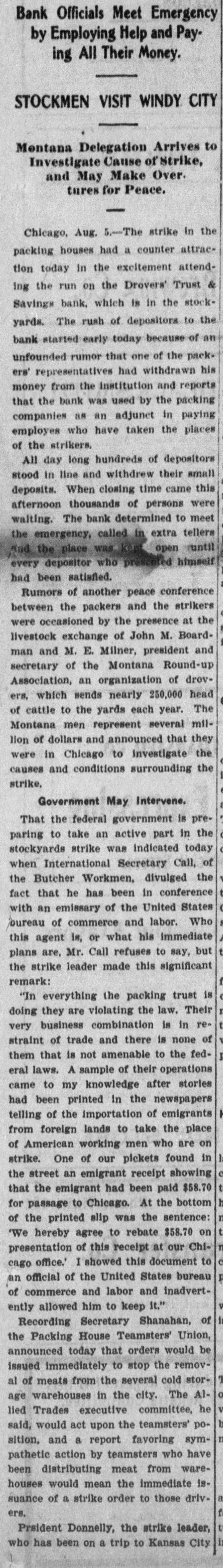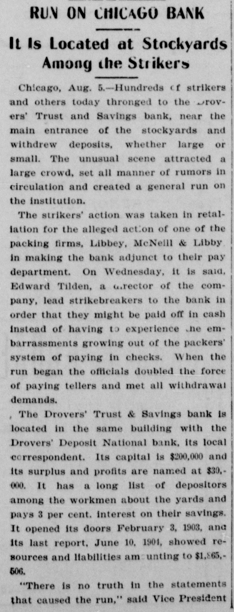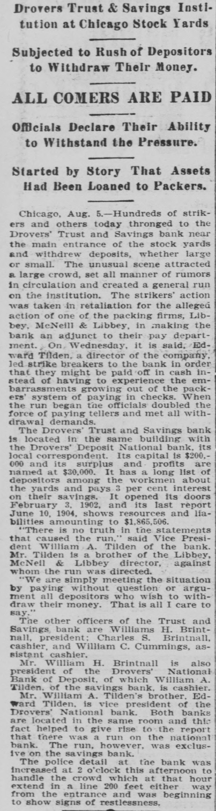 Drovers Trust & Savings Institution at Chicago Stock Yards Subjected to Rush of Depositors to Withdraw Their Money. ALL COMERS ARE PAID Officials Declare Their Ability to Withstand the Pressure. Started by Story That Assets Had Been Loaned to Packers. Chicago, Aug. 5.-Hundreds of strikers and others today thronged to the Drovers' Trust and Savings bank near the main entrance of the stock yards and withdrew deposits, whether large or small. The unusual scene attracted a large crowd, set all manner of rumors in circulation and created a general run on the institution. The strikers' action was taken in retaliation for the alleged action of one of the packing firms, Libbey, McNeill & Libbey, in making the bank an adjunct to their pay department. On, Wednesday, it is said, Edward Tilden, a director of the company, led strike breakers to the bank in order that they might be paid off in cash instead of having to experience the embarrassments growing out of the packers' system of paying in checks. When the run began the officials doubled the force of paying tellers and met all withdrawal demands. The Drovers' Trust and Savings bank is located in the same building with the Drovers' Deposit National bank, its local correspondent. Its capital is $200,000 and its surplus and profits are named at $30,000. It has a long list of depositors among the workmen about the yards and pays 3 per cent interest on their savings. It opened its doors February 3, 1902, and its last report June 10, 1904, shows resources and liabilities amounting to $1,865,506. "There is no truth in the statements that caused the run." said Vice President William A. Tilden of the bank. Mr. Tilden is a brother of the Libbey, McNeil & Libbey director, against whom the run was directed. "We are simply meeting the situation by paying without question or argument all depositors who wish to withdraw their money. That is all I care to say." The other officers of the Trust and Savings bank are Williams H. Brintnall, president: Charles S. Brintnall, cashier, and William C. Cummings, assistant cashier. Mr. William H. Brintnall is also president of the Drovers' National Bank of Deposit, of which William A. Tilden. of the savings bank. is cashier. Mr. William A. Tilden's brother. Edward Tilden, is vice president of the Drovers' National bank. Both banks are located in the same room and this fact helped to give rise to the report that there was a run on the national bank. The run, however, was exclusive on the savings bank. The police detail at the bank was increased at 2 o'clock this afternoon to handle the crowd which at that hour extend in a line 200 feet either way from the entrance and was beginning to show signs of restlessness.