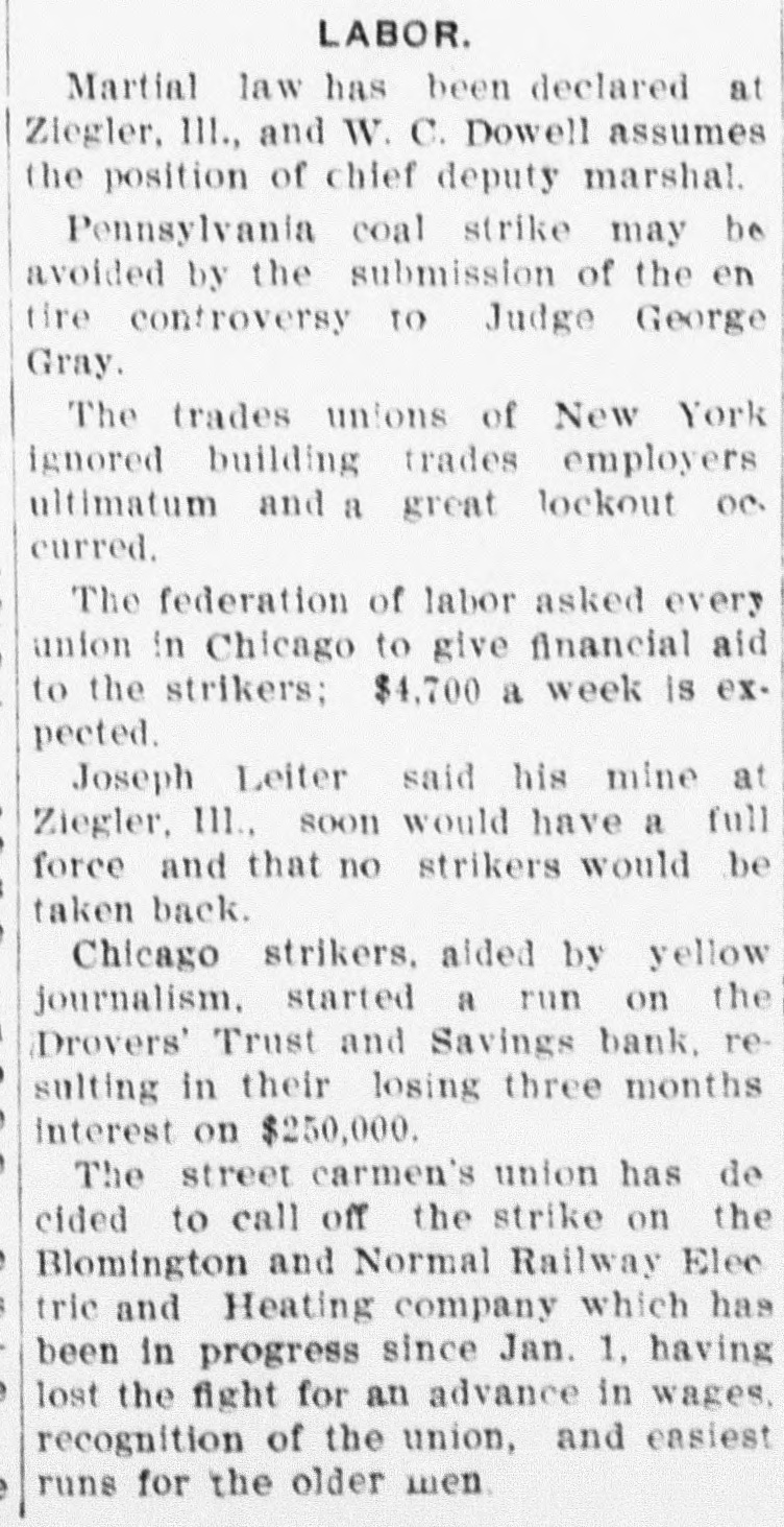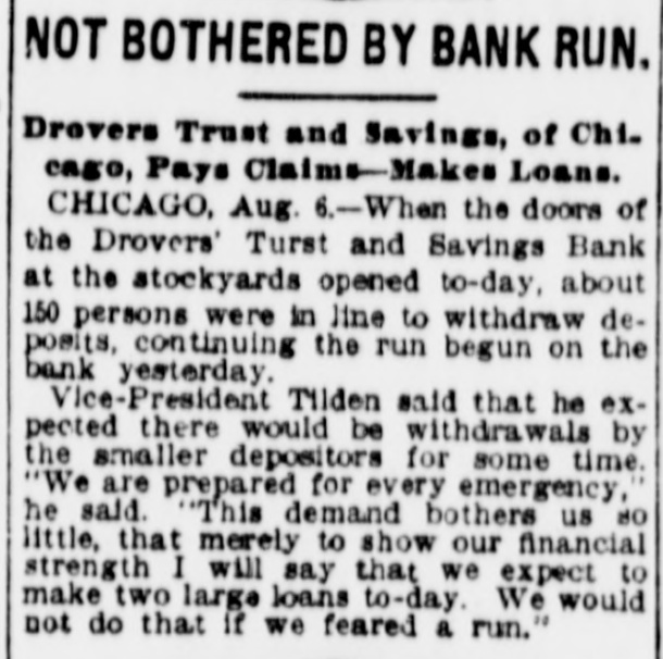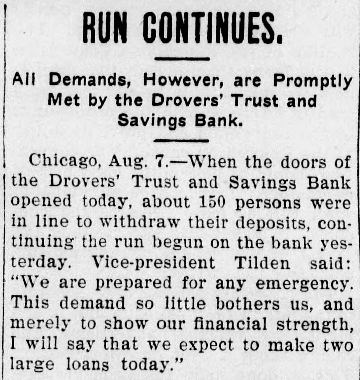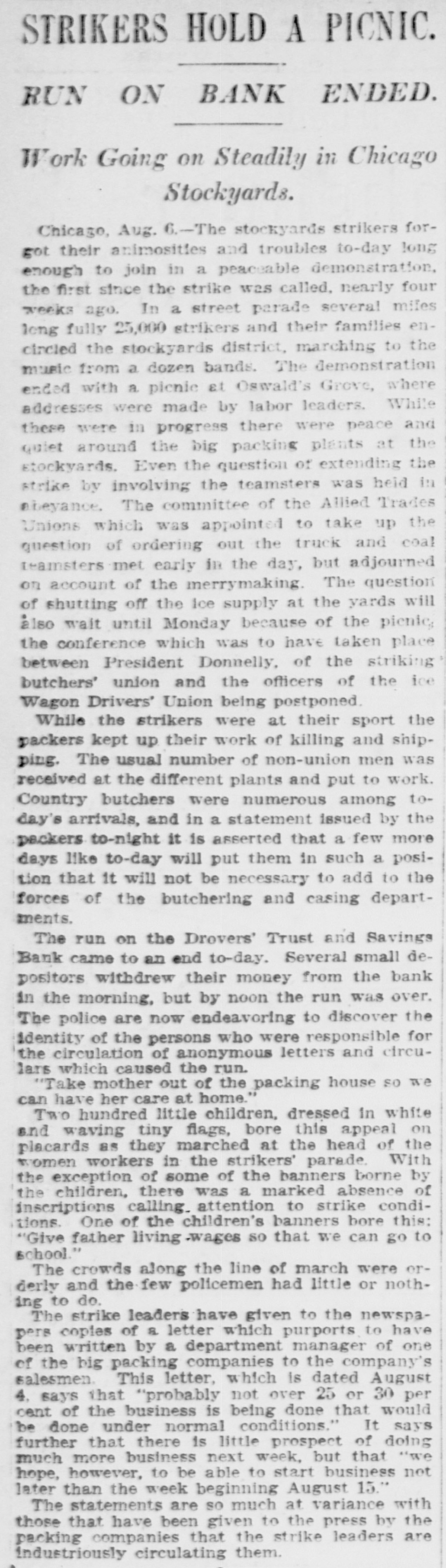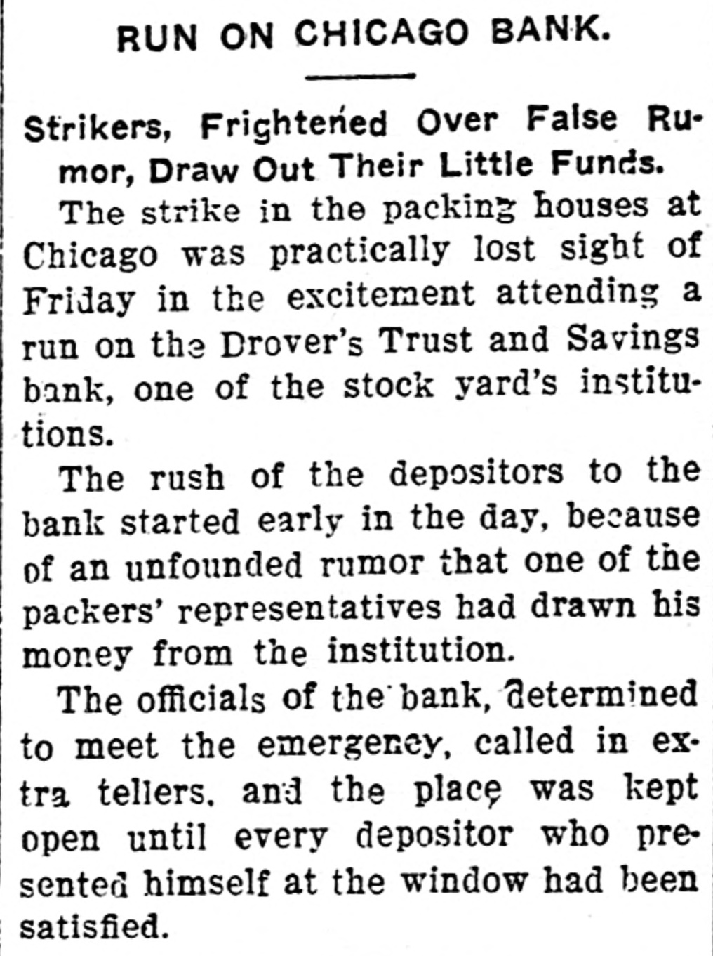Drovers Trust & Savings Institution at Chicago Stock Yards Subjected to Rush of Depositors to Withdraw Their Money. ALL COMERS ARE PAID Officials Declare Their Ability to Withstand the Pressure. Started by Story That Assets Had Been Loaned to Packers. Chicago, Aug. 5.-Hundreds of strikers and others today thronged to the Drovers' Trust and Savings bank near the main entrance of the stock yards and withdrew deposits, whether large or small. The unusual scene attracted a large crowd, set all manner of rumors in circulation and created a general run on the institution. The strikers' action was taken in retaliation for the alleged action of one of the packing firms, Libbey, McNeill & Libbey, in making the bank an adjunct to their pay department. On, Wednesday, it is said, Edward Tilden, a director of the company, led strike breakers to the bank in order that they might be paid off in cash instead of having to experience the embarrassments growing out of the packers' system of paying in checks. When the run began the officials doubled the force of paying tellers and met all withdrawal demands. The Drovers' Trust and Savings bank is located in the same building with the Drovers' Deposit National bank, its local correspondent. Its capital is $200,000 and its surplus and profits are named at $30,000. It has a long list of depositors among the workmen about the yards and pays 3 per cent interest on their savings. It opened its doors February 3, 1902, and its last report June 10, 1904, shows resources and liabilities amounting to $1,865,506. "There is no truth in the statements that caused the run." said Vice President William A. Tilden of the bank. Mr. Tilden is a brother of the Libbey, McNeil & Libbey director, against whom the run was directed. "We are simply meeting the situation by paying without question or argument all depositors who wish to withdraw their money. That is all I care to say." The other officers of the Trust and Savings bank are Williams H. Brintnall, president: Charles S. Brintnall, cashier, and William C. Cummings, assistant cashier. Mr. William H. Brintnall is also president of the Drovers' National Bank of Deposit, of which William A. Tilden. of the savings bank. is cashier. Mr. William A. Tilden's brother. Edward Tilden, is vice president of the Drovers' National bank. Both banks are located in the same room and this fact helped to give rise to the report that there was a run on the national bank. The run, however, was exclusive on the savings bank. The police detail at the bank was increased at 2 o'clock this afternoon to handle the crowd which at that hour extend in a line 200 feet either way from the entrance and was beginning to show signs of restlessness.