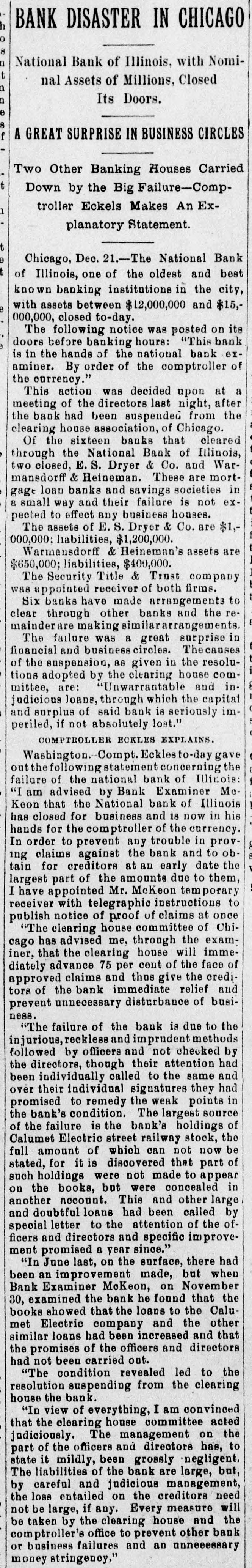 BANK DISASTER IN CHICAGO National Bank of Illinois, with Nominal Assets of Millions, Closed Its Doors. A GREAT SURPRISE IN BUSINESS CIRCLES Two Other Banking Houses Carried Down by the Big Failure-Comptroller Eckels Makes An Explanatory Statement. Chicago, Dec. 21.-The National Bank of Illinois, one of the oldest and best known banking institutions in the city, with assets between $12,000,000 and $15,000,000, closed to-day. The following notice was posted on its doors is exin the before hands banking of the hours: national "This bank bank aminer. By order of the comptroller of the currency." This action was decided upon at a meeting after the the bank of had the been directors suspended last night, from clearing house association, of Chicago. Of the sixteen banks that cleared through the National Bank of Illinois, two closed, E. S. Dryer & Co. and Warmansdorff & Heineman. These are mortgage loan banks and savings societies in a small way and their failure is not expected to effect any business houses. The assets of E. S. Dryer & Co. are $1,000,000; liabilities, $1,200,000. Warmausdorff & Heineman's assets are $650,000; liabilities, $400,000. The Security Title & Trust company was appointed receiver of both firms. Six banks have made arrangements to clear through other banks and the remainderare making similararrangements. The failure was a great surprise in financial and business circles. The causes of the suspension, as given in the resolutions adopted by the clearing house committee, are: "Unwarrantable and injudicious Joane, through which the capital and surplus of said bank is seriously imperiled, if not absolutely lost." COMPTROLLER ECKLES EXPLAINS. Washington. Compt. Eckles to-day gave thefollowingstatementconcerning the failure Mc. am advised of the national by Bank bank Examiner of Illicois Keon that the National bank of Illinois has closed for business and 18 now in his hands for the comptroller of the currency. In order to prevent any trouble in proving claims against the bank and to obtain for creditors at an early date the largest part of the amounts due to them, I have appointed Mr. McKeon temporary receiver with telegraphic instructions to publish notice of proof of claims at once "The clearing house committee of Chicago has advised me. through the examiner, that the clearing house will immeof approved diately advance claims 75 and immediate per thus cent give of relief the the face creditors of the bank and prevent unnecessary disturbance of business. "The failure of the bank is due to the injurious, reckless and imprudent methods followed by the had been same and directors, individually by officers though called and their to not the attention checked over in the source promised bank's their individual condition. to remedy the signatures The weak largest points they had of the failure is the bank's holdings of Calumet Electric street railway stock, the full amount of which can not now be stated, for it is discovered that part of such holdings were not made to appear on were in another the books, account. but This had been and concealed other called large and doubtful loans by special letter to the attention of the officers and directors and specific improvement promised a year since." "In June last, on the surface, there had been an improvement made, but when Bank Examiner McKeon, on November 30, examined the bank he found that the books showed that the loans to the Calumet Electric company and the other similar loans had been increased and that the promises of the officers and directors had not been carried out. "The condition revealed led to the resolution suspending from the clearing house the bank. "In view of everything, I am convinced that the clearing house committee acted on of the to state part judiciously. officers The and management directors negligent. has, the The are but, careful liabilities it mildly, and of been the judicious bank grossly management, large, by the on need not be measure will be taken loss large, entailed by the if any. clearing Every the house creditors and the comptroller's office to prevent other bank or business failures and an unneeessary money stringency."