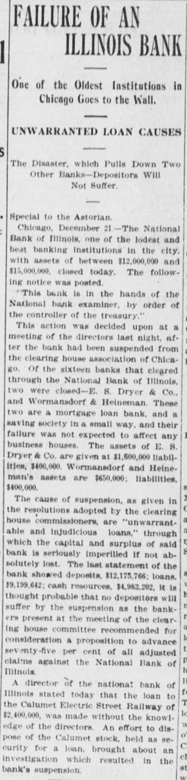 BIC BANK FAILS. National Bank of Illinois at Chicago Closes. Liabilities Placed at $11,000,000, Assets $15,000,000. Dabbling In Electric Street Railway Stock CAUSED THE DISASTER Comptroller Eckels Severely Criticizes Bank Management. Warned the Directors Many Months Ago, He Says Chicago, Dec. 21 The National Bank of Illinois, one of the oldest and best known banking institutions in the city, and with assets of between $12,000,000 and $15,000,000. closed its doors today The liabilities are $11,000,000. The following notice was posted on the doors before the opening of banking hours "This bank is in the hands of the national bank exchange, by order of the comptroller of the currency This action was decided upon at a meeting of the directors of the bank last night after the bank had been suspended from the clearing house association of Chicago at a meeting of the clearing house committee held earlier in the day Of the 16 banks that cleared through the National Bank of Illinois, two closed their doors as a result of the closing of that institution. They are E S. Dry& er & Co., and Wasmansdordoff Heinemann These two institutions are mortgage loan banks and saving societies in a small way, and their failure is not expected to effect any business houses. The assets of E S. Dryer & Co. are given at $1,600,000, with liabilities of $1.200.000. The figures for Wasmansdorft & Heinemann are approximately, assets $650,000 liabilities $400,000. The Security Title and Trust compafor both was appoint ny firms. Six banks have made ments to clear thr ough other banks and the balance of the are making similar arrangements as fast as possib The failure was a great surprise in financial circle: and business The causes of the suspension, as given in the resolutions adopted by the clearing house committee are 'unwarrantable and injudicious loans' through which the capital and surplus of said bank is seriously imperilled, if not absolutely lost The was made today that a loan of about $2,400,000 to the Calumet Street Railroad company of which J W Farson of Farson, Leach Co..is president had caused the National Bank of to suspend. Illinois Mr Farson declined to make a statement on that subject but stated that the failure would not affect the Calumet road. Heavy loans on real estate are also said to have been made The last statement of the bank showed deposits $12,175,766 loans, $9,199,642; cash $4,983,902 It is thought probable that none of the depositor will suffer by the suspension, as the bankers who were presthe of at the committee have for consideration the proposition to advance per cent on all adjusted claims against the National Bank of Illinois In addition to this they have agreed to use their influence with all other members of the clearing house association to accept all such claims as collateral at the same ratio The National Bank of Illinois was organized in August, 1871. with a capital stock of $300,000 which was subsequentlv increased to $1,000,000 It was regardone of the soundest financial inthe of stitutions The Press club is one of the sufferers by the suspension, all the proceeds of the advance sale of tickets for the football game between the Carlisle Indians and University of Wisconsin eleven. which was held under the management the Press club, amounting to over 000, having been deposited Saturday, One of the leading bankers and finaneiers of this city at noon today said to an Associated press reporter The failure of the National Bank of Illinois has created no disturbance of consequence financial circles here One private bankers who really nothing but dealers have failed, but this is only a natural consequence of shrinking real estate valThe principal source of trouble of the National Bank of Illinois was a loan of $2,400,000 to the Calumet Electric Railway company This with three or four loans, threatened severe losses and the clearing house committee saw way but to suspend the bank. The loss in liquidation be small if any to depositors It is not probable that the bank will resume business NEW YORK CORRESPONDENTS New York Dec. 21.-Officials of the Mercantile and the American Exchange National banks of this respond ents the National Bank Illinois say they will not be affected any important extent by its failure The American Exchange has merely handled collections for the Chicago bank and is actually a debtor to it The Mercantile National bank people say that the Chicago bank does not them except for notes in their hands for coland deep sympathy for the officials of the Chicago bank AT WASHINGTON Washington, Dec Comptroller Eckels has received an the National Bank of Illinois. It says that the Chicago clearing house has to pay of all proved claims John C. McK ean been appointed a receiver for bank and to publish a list of all at so that may get the benefit of this issued banks ing the bank as their prove their claims in. them send the report of the bank which 30. the bank had a cap of $1,000,000 surplus of $1,000,000 undivided of $450.000 and a total of bonds 5.046.952, its liabilities will be about $10,100,000. While it is feared that serious results may follow Comptroller Eckels will do all in his power to relieve the