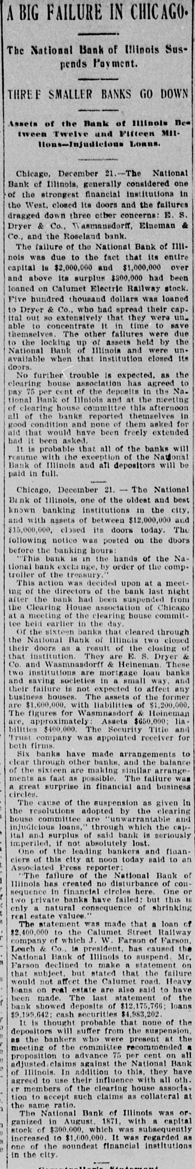 CHICAGO, Dec. 21.-The National Bank of Illinois, one of the oldest and best known banking Institutions in the city, with assets of between twelve and fifteen million dollars, closed its doors to-day. The following notice was posted on the doors before the opening of banking hours: "This bank 13 In the hands of the national bank examiner. By order of the comptroller of the treasury." This action was decided upon at a meeting of the directors of the bank last night after the bank had been sus. pended from the clearing house ASSO- the at the meeting of house committee held clation clearing of Chicago banks earller that in Of the sixteen the National closed their as Illinois, cleared the day. through two doors institution. Bank a re- of of the closing of that sult They are E. S. Dryer & Co. and Was- two & Heinemann These are mortgage Institutions mansdorff small loan banks and and saving societies in n way their failure is not expected to effect any business houses. The assets of E. S. Dryer & Co. are given at $1,000,000, with liabilities of $1. The figures for Wasmanedorff & are As200,000. Heinemann approximately: $400,000. The $50,000: Habilities, sets. Security Title and Trust Co. was ap- Six pointed receiver for both firms. to clear banks have made arrangements through other banks and the balance of the sixteen are making similar arrangements as fast as possible. failure was at great surprise in and business of the suspensions as financial The The causes circles. given the resolutions adopted by the clearIn house committee are "unwarrantaing ble and injudicious loans. through which "the capital and surplus of abso- said bank Is seriously imperilled If not lutely lost." The statement was made of a loan of to the Calumet of which about Railrood $2,400,000 Company J. is W. Street prest- Farof Farson. Leach & Co., son. dent. had caused the National Bank declin- of to Mr. Farson ed a statement on but that the failure Illinois to stated make suspend. that would subject. loans not affect the Calmmet road. Heavy real estate are also said to have bank been on The last statement of the made. showed deposits. $12,175,766 loans. $9.cash resources $1,953,202. thought probable that none of will suffer by 199.612: It depositors Is the suspenelon. the as the bankers who were present at the meeting of the committee have the recommended for consideration proposition to advance 75 per cent on all claims against the National Illinois. In aujusted Bank of addition influence to this have agreed to use their members of to accept they with house other association the all clearing ratlo. such claims as collateral at the same The National Bank of Illionis was orin August. 1871, with a capital which WRS to $1,000,000. stock ganized increased of $300,000. subsequent It financial was regarded ly as one 02 the soundest institudos In the city. The Press club is one of the sufferers the suspension. all the proceeds foot- of by sale of tickets for the between the Carlisle of Wisconsin and bail the advance the game University Indians eleven, which was held under the management of the Press club. amounting to over $3,000. having been deposited Saturday. It was announced tha the Drovers' Na. tional Bank, which cleared through the National Bank of Illinois will clear through the Commercial National The West Side Bank will also clear through the Commercial National. had but little effect the wheat pit or on either The in suspension the showed stock exchange. Wheat indeed strength after the opening the decline and the stock market was dull and only fractionally lower. Neither the bank examiner nor any officer of the National Bank of Illinois will make any statement at present. of the National Bank of IIIto-day that the Colume: Electric Street inols A the director stated loan Rallway made of to $2,400.000 was without the knowledge to of the directors. The efforts made the Calumet stock was for the loan. atdispose held as of security about which drew the intention to it and brought vestigation which resulted in the bank's suspension.