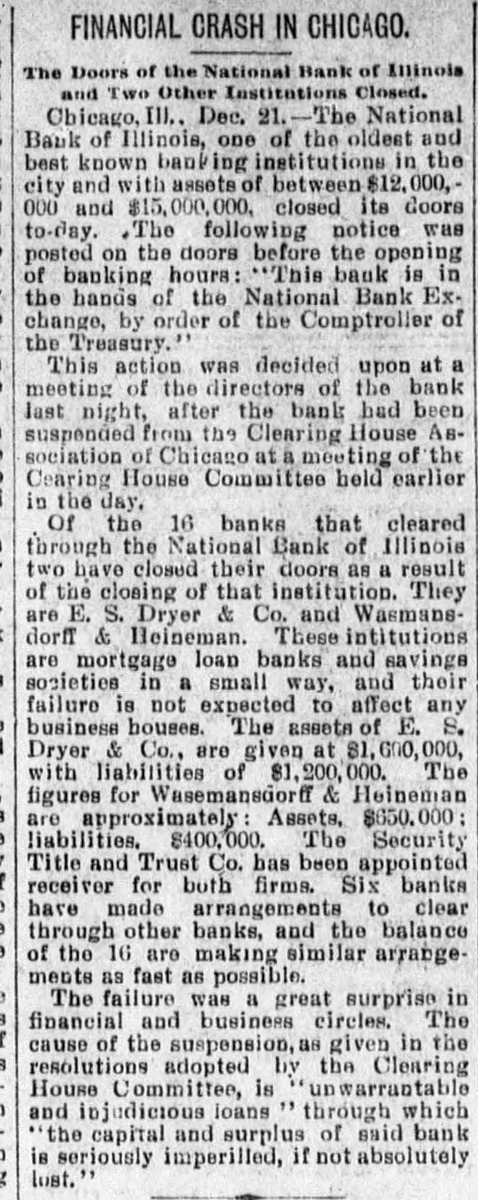 FINANCIAL CRASH IN CHICAGO. The Doors of the National Bank of Illinois and Two Other Institutions Closed. Chicago, III., Dec. 21.-The National Bank of Illinois, one of the oldest and best known banking institutions in the city and with assets of between $12,000,000 and $15,000,000, closed its doors to-day. ,The following notice was posted on the doors before the opening of banking hours: This bank is in the hands of the National Bank Exchange, by order of the Comptroller of the Treasury." This action was decided upon at a meeting of the directors of the bank last night, after the bank had been suspended from the Clearing House Association of Chicago at a meeting of the Cearing House Committee held earlier in the day. Of the 16 banks that cleared through the National Bank of Illinois two have closed their doors as a result of the closing of that institution. They are E. S. Dryer & Co. and Wasmansdorff & Heineman. These intitutions are mortgage loan banks and savings societies in a small way, and their failure is not expected to affect any business houses. The assets of E. S. Dryer & Co., are given at $1,600,000, with liabilities of $1,200,000. The figures for Wasemansdorff & Heineman are approximately Assets, $650.000 liabilities. $400,000. The Security Title and Trust Co. has been appointed receiver for both firms. Six banks have made arrangements to clear through other banks, and the balance of the 16 are making similar arrangements as fast as possible. The failure was a great surprise in financial and business circles. The cause of the suspension, as given in the resolutions adopted by the Clearing House Committee, is unwarrantable and injudicious loans " through which "the capital and surplus of said bank is seriously imperilled, if not absolutely lost."