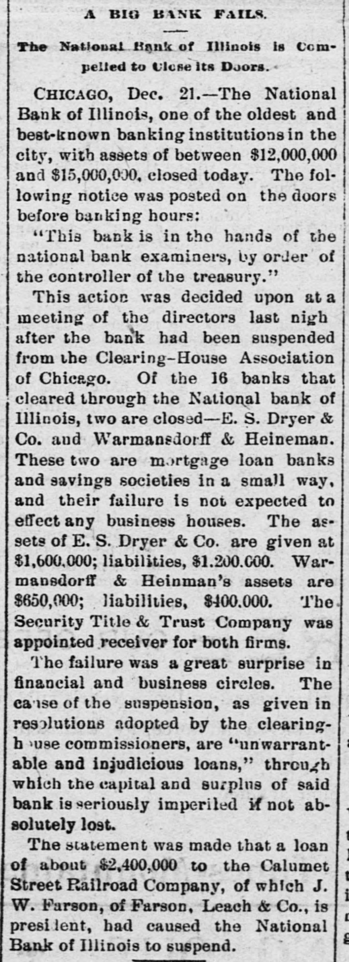A BIG BANK FAILS. The National Bank of Illinois is Compelled to Close its Doors. CHICAGO, Dec. 21.-The National Bank of Illinois, one of the oldest and best-known banking institutions in the city, with assets of between $12,000,000 and $15,000,000, closed today. The following notice was posted on the doors before banking hours: "This bank is in the hands of the national bank examiners, by order of the controller of the treasury." This action was decided upon at a meeting of the directors last nigh after the bank had been suspended from the Clearing-House Association of Chicago. Of the 16 banks that cleared through the National bank of Illinois, two are closed-E. S. Dryer & Co. and Warmansdorff & Heineman. These two are mortgage loan banks and savings societies in a small way, and their failure is not expected to effect any business houses. The assets of E.S. Dryer & Co. are given at $1,600,000; liabilities, $1,200.000. Warmansdorff & Heinman's assets are $650,000; liabilities, $400,000. The Security Title & Trust Company was appointed receiver for both firms. The failure was a great surprise in financial and business circles. The cause of the suspension, as given in resolutions adopted by the clearingh use commissioners, are "unwarrantable and injudicious loans," through which the capital and surplus of said bank is seriously imperiled if not absolutely lost. The statement was made that a loan of about $2,400,000 to the Calumet Street Railroad Company, of which J. W. Farson, of Farson, Leach & Co., is presi lent, had caused the National Bank of Illinois to suspend.