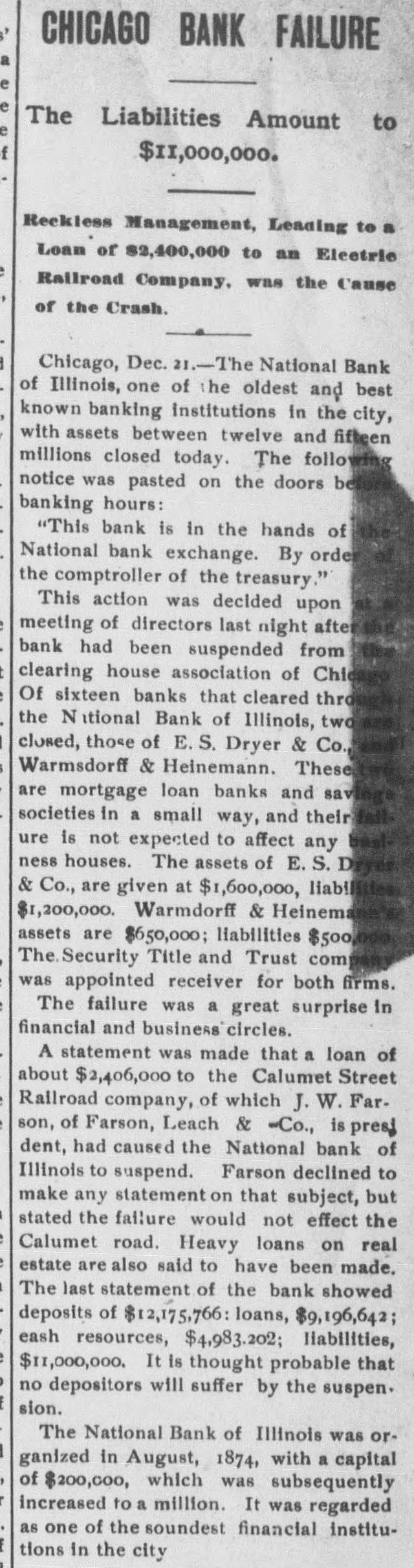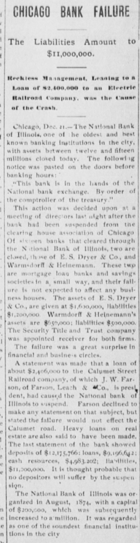 CHICAGO BANK FAILURE The Liabilities Amount to $11,000,000. Reckless Management, Leading to a Loan or $2,400,000 to an Electric Railroad Company, was the Cause of the Crash. Chicago, Dec. 21.-The National Bank of Illinois, one of the oldest and best known banking institutions in the city, with assets between twelve and fifteen millions closed today. The following notice was pasted on the doors be banking hours: "This bank is in the hands of the National bank exchange. By order the comptroller of the treasury." This action was decided upon meeting of directors last night after bank had been suspended from clearing house association of Chic Of sixteen banks that cleared thro the National Bank of Illinois, two closed, those of E.S. Dryer & Co., Warmsdorff & Heinemann. These are mortgage loan banks and savings societies in a small way, and their ure is not expected to affect any ness houses. The assets of E.S. Dryer & Co., are given at $1,600,000, liab!! $1,200,000. Warmdorff & Heinema assets are $650,000; liabilities $500, The. Security Title and Trust company was appointed receiver for both firms. The failure was a great surprise in financial and business circles. A statement was made that a loan of about $2,406,000 to the Calumet Street Railroad company, of which J. W. Farson, of Farson, Leach & «Co., is presi dent, had caused the National bank of Illinois to suspend. Farson declined to make any statement on that subject, but stated the failure would not effect the Calumet road. Heavy loans on real estate are also said to have been made. The last statement of the bank showed deposits of $12,175,766: loans, $9,196,642; eash resources, $4,983.202; liabilities, $11,000,000. It is thought probable that no depositors will suffer by the suspen. sion. The National Bank of Illinois was organized in August, 1874, with a capital of $200,000, which was subsequently increased to a million. It was regarded as one of the soundest financial institutions in the city