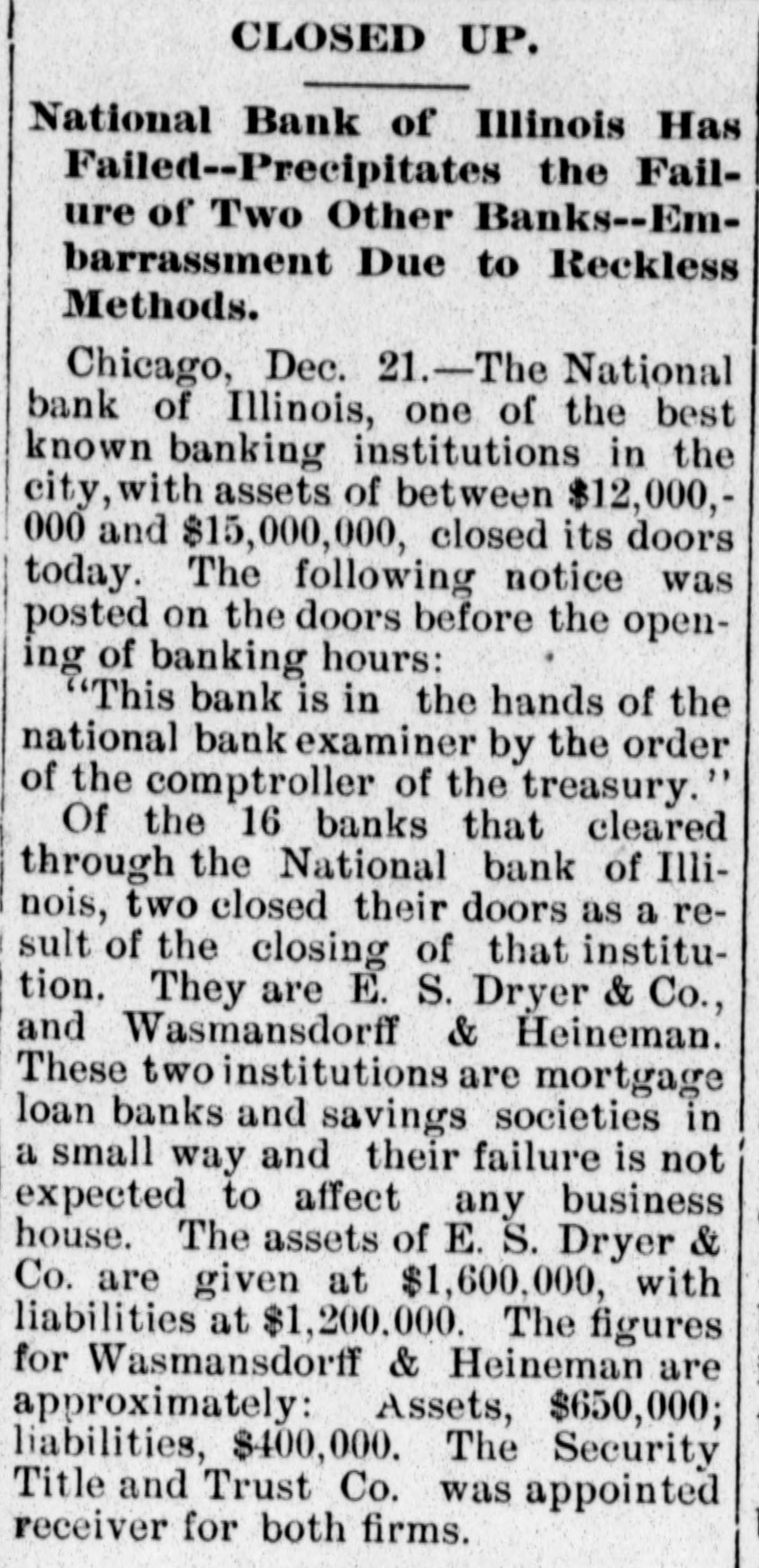 CLOSED UP. National Bank of Illinois Has Failed--Precipitates the Failure of Two Other Banks--Embarrassment Due to Reckless Methods. Chicago, Dec. 21.-The National bank of Illinois, one of the best known banking institutions in the city, with assets of between $12,000,000 and $15,000,000, closed its doors today. The following notice was posted on the doors before the opening of banking hours: "This bank is in the hands of the national bank examiner by the order of the comptroller of the treasury." Of the 16 banks that cleared through the National bank of Illinois, two closed their doors as a result of the closing of that institution. They are E. S. Dryer & Co., and Wasmansdorff & Heineman. These two institutions are mortgage loan banks and savings societies in a small way and their failure is not expected to affect any business house. The assets of E. S. Dryer & Co. are given at $1,600,000, with liabilities at $1,200,000. The figures for Wasmansdorff & Heineman are approximately: Assets, $650,000; liabilities, $400,000. The Security Title and Trust Co. was appointed receiver for both firms.