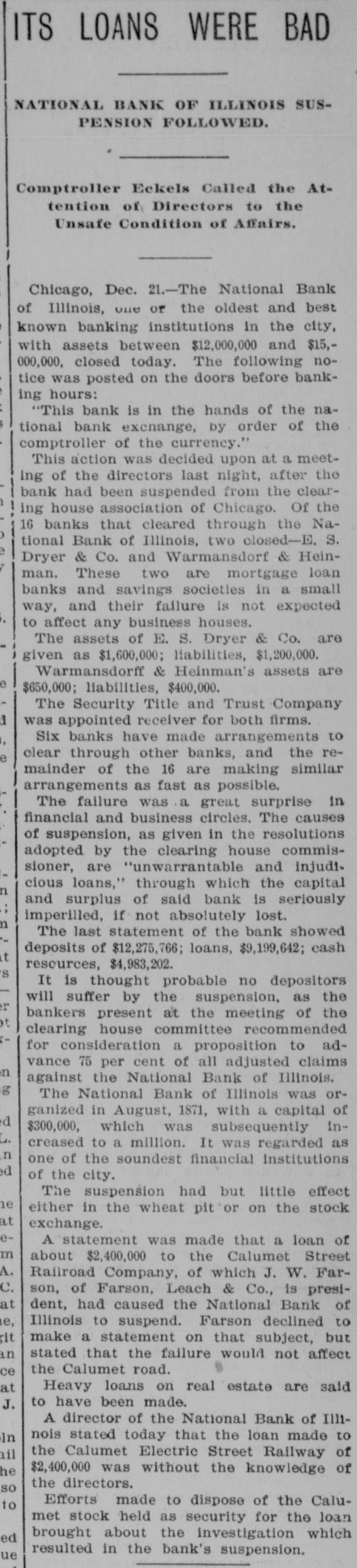 ITS LOANS WERE BAD NATIONAL BANK OF ILLINOIS SUSPENSION FOLLOWED. Comptroller Eckels Called the Attention of Directors to the Unsafe Condition of Affairs. Chicago, Dec. 21.-The National Bank of Illinois, one or the oldest and best known banking institutions in the city, with assets between $12,000,000 and $15,000,000, closed today. The following notice was posted on the doors before banking hours: "This bank is in the hands of the national bank exchange, by order of the comptroller of the currency." This action was decided upon at a meetIng of the directors last night, after the bank had been suspended from the clearing house association of Chicago. Of the 16 banks that cleared through the National Bank of Illinois, two closed-E. S. Dryer & Co. and Warmansdorf & Heinman. These two are mortgage loan banks and savings societies in a small way, and their failure is not expected to affect any business houses. The assets of E. S. Dryer & Co. are given as $1,600,000; liabilities, $1,200,000. Warmansdorff & Heinman's assets are $650,000; liabilities, $400,000. The Security Title and Trust Company d was appointed receiver for both firms. Six banks have made arrangements to clear through other banks, and the remainder of the 16 are making similar arrangements as fast as possible. The failure was a great surprise in financial and business circles. The causes of suspension, as given in the resolutions adopted by the clearing house commissioner, are "unwarrantable and injudicious loans," through which the capital n and surplus of said bank is seriously imperilled, if not absolutely lost. n The last statement of the bank showed deposits of $12,275,766; loans, $9,199,642; cash resources, $4,983,202. S It is thought probable no depositors will suffer by the suspension, as the r bankers present at the meeting of the clearing house committee recommended for consideration a proposition to advance 75 per cent of all adjusted claims in against the National Bank of Illinois. g The National Bank of Illinois was organized in August, 1871, with a capital of d $300,000, which was subsequently increased to a million. It was regarded as n one of the soundest financial Institutions d of the city. The suspension had but little effect 1e either in the wheat pit or on the stock at exchange. eA statement was made that a loan of m about $2,400,000 to the Calumet Street A. Railroad Company, of which J. W. FarC. son, of Farson, Leach & Co., is presiat dent, had caused the National Bank of e, Illinois to suspend. Farson declined to it make a statement on that subject, but an stated that the failure would not affect the Calumet road. ce Heavy loans on real estate are said at to have been made. J. A director of the National Bank of Ill1nois stated today that the loan made to In the Calumet Electric Street Railway of ail $2,400,000 was without the knowledge of he the directors. so Efforts made to dispose of the Caluto met stock held as security for the loan brought about the investigation which ed resulted in the bank's suspension. ue