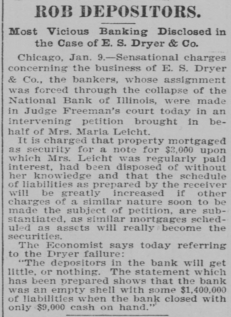 ROB DEPOSITORS. Most Vicious Banking Disclosed in the Case of E. S. Dryer & Co. Chicago, Jan. 9.-Sensational charges concerning the business of E. S. Dryer & Co., the bankers, whose assignment was forced through the collapse of the National Bank of Illinois, were made in Judge Freeman's court today in an intervening petition brought in behalf of Mrs. Maria Leicht. It is charged that property mortgaged as security for a note for $3,000 upon which Mrs. Leicht was regularly paid interest, had been disposed of without her knowledge and that the schedule of liabilities as prepared by the receiver will be greatly increased if other charges of a similar nature soon to be made the subject of petition, are substantiated, as similar mortgages scheduled as assets will really become the securities. The Economist says today referring to the Dryer failure: "The depositors in the bank will get little, or nothing. The statement which has been prepared shows that the bank was an empty shell with some $1,400,000 of liabilities when the bank closed with only $9,000 cash on hand.'