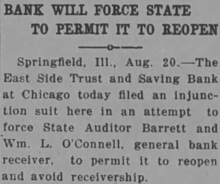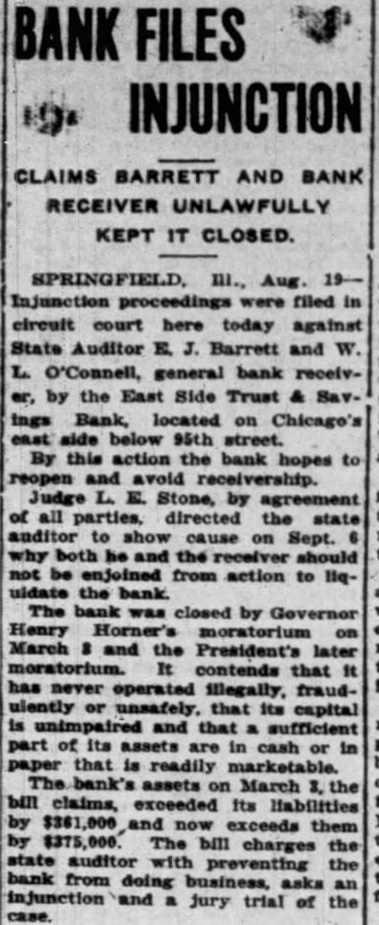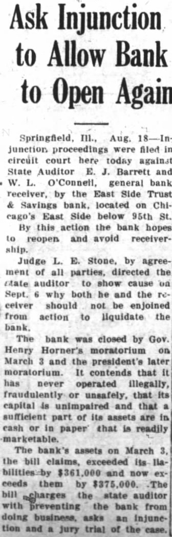 injunction proceedings were filed ... against State Auditor E. Barrett and W. O'Connell, general bank receiver, by the East Side Trust Savings bank ... the bank hopes to reopen and avoid receivership. The bank was closed by Gov. Henry Horner's moratorium on March ... The bill charges the state auditor with preventing the bank from doing [business]. (Belvidere Daily Republican, 1933-08-18).