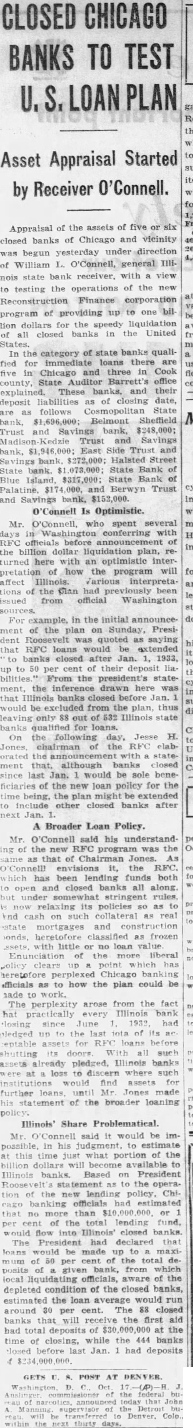 CLOSED CHICAGO BANKS TO TEST U. LOAN PLAN Asset Appraisal Started by Receiver O'Connell. Appraisal of the assets of five six closed banks of Chicago and vicinity was begun yesterday under direction of William L. O'Connell, general IIIInois state bank receiver, with a view to testing the operations of the new Reconstruction Finance corporation program of providing up to one billion for the speedy liquidation of all closed banks in the United States. the category of state banks qualified for immediate loans there are five in Chicago and three in Cook county, State Auditor Barrett's office explained. These banks, and their deposit liabilities as of closing date, are as follows Cosmopolitan State bank, 696,000; Belmont Sheffield Trust and Savings bank, $248,000; Madison Kedzie Trust and Savings bank, $1,946,000; East Side Trust and Savings bank, $272,000; Halsted Street State bank. $1,073,000; State Bank of Blue Island, $317,000: State Bank of Palatine, $174 1,000, Berwyn Trust and bank, $152,000. 'Connell Is Optimistic. Mr. O'Connell, who spent several days in Washington conferring with RFC officials before announcement of the billion dollar liquidation plan, returned here with an optimistic interpretation of how the program will affect Illinois. Various interpretations of the had been issued from official Washington For example, in the initial announceof the plan on Sunday, President was quoted as saying that RFC loans would be extended banks closed after Jan. 1, 1933, up to 50 per cent of their deposit liabilities. From the president's statement, the inference drawn here was that Illinois banks closed before Jan. would be from the plan, thus only 88 out of 532 Illinois state banks qualified for loans. On the following day, Jesse H. Jones, chairman of the RFC elaborated the announcement with statement that, although banks closed since last Jan. would be sole beneficiaries of the new loan policy for the time being, the plan might be extended to include other closed banks after next Jan. A Broader Loan Policy. Mr. O'Connell said his understandIng of the new RFC program was the same as that of Chairman Jones. As O'Connelll envisions it, the RFC. which has been lending funds both to open and closed banks all along. but under stringent rules, relaxing its policies so as to knd cash on such collateral as real mortgages and construction onds, heretofore as frozen with little or no loan value Enunciation of the liberal policy up point which has heretofore perplexed Chicago banking fficials as to how the plan could be hade to work. The perplexity arose from the fact hat practically every Illinois bank since June had eptable assets for RFC loans before shutting doors With all such assets already pledged. Illinois banks at loss to discern where such institutions would find assets for further loans Mr Jones made his statement of the broader loaning policy Illinois' Share Problematical. Mr. Connell said it would be impossible, in his judgment, to estimate this time just what portion of the billion dollars will become available to Illinois banks. Based on President atement as to the opera. tion of the new policy. Chibanking officials had that no than or per cent of the total lending fund, flow into Illinois' closed banks The President had declared that loans be made up to maximum of 50 per of the total deposits given bank, from which local liquidating officials, aware of the depleted condition of the closed banks, estimated the loan average would run around 30 per cent. The 88 closed banks that will receive the first aid had total deposits of 000,000 at the time of closing, while the 444 banks closed before last Jan. had deposits POST AT the the the thirty