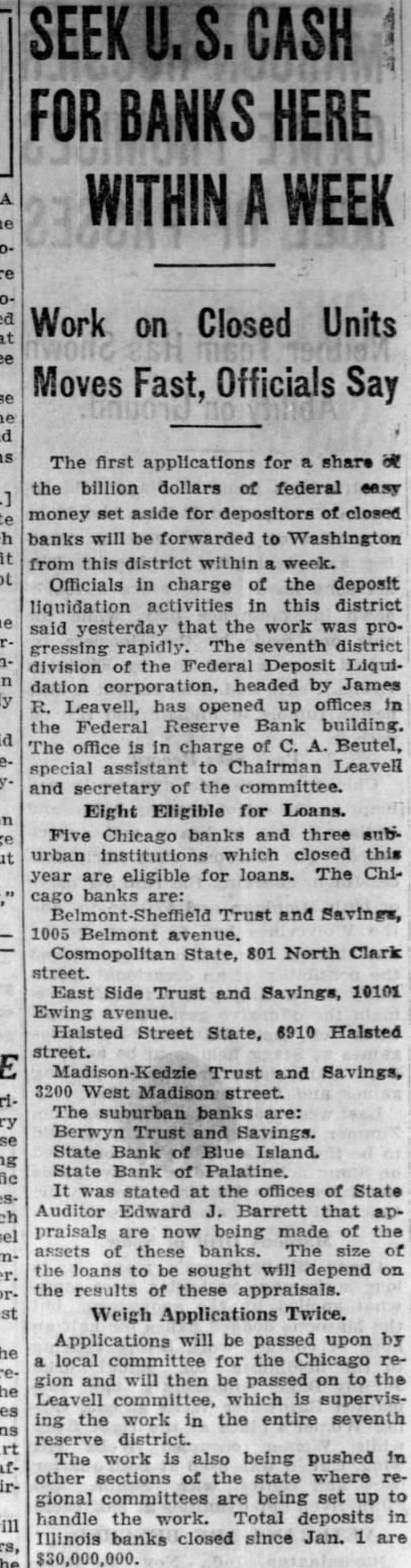 SEEK U. S. CASH FOR BANKS HERE WITHIN A WEEK Work on Closed Units Moves Fast, Officials Say The first applications for share * the billion dollars of federal easy money set aside for depositors of closed banks will be forwarded to Washington this within week. Officials in charge of the deposit activities in this district said yesterday that the work was progressing The seventh division of the Deposit Liquidation headed by James R. Leavell, has up offices in the Federal Reserve Bank building. The office is In charge of C. A. Beutel, to Chairman Leavell and secretary of the committee. Eight Eligible for Loans. Five Chicago banks and three suburban institutions closed this year are eligible for loans. The Chibanks are: Trust and Savings, 1005 Belmont avenue. State, 801 North Clark street. East Side Trust and Savings, 10101 Ewing Halsted Street State, 6910 Halsted Kedzie Trust and Savings, 3200 West The suburban banks are: State Bank of Blue Island. Bank of stated at the offices of State Auditor Edward Barrett that appraisals being made of the of banks. of the loans to be sought will depend on the results of these appraisals. Weigh Applications Twice. will be passed upon by local for the Chicago region and will then be on to the which supervising the work in the entire seventh district. The work is also being pushed in other sections of the state where regional committees are being set up to handle the work. Total deposits in Illinois banks closed since Jan. 1 are $30,000,000.